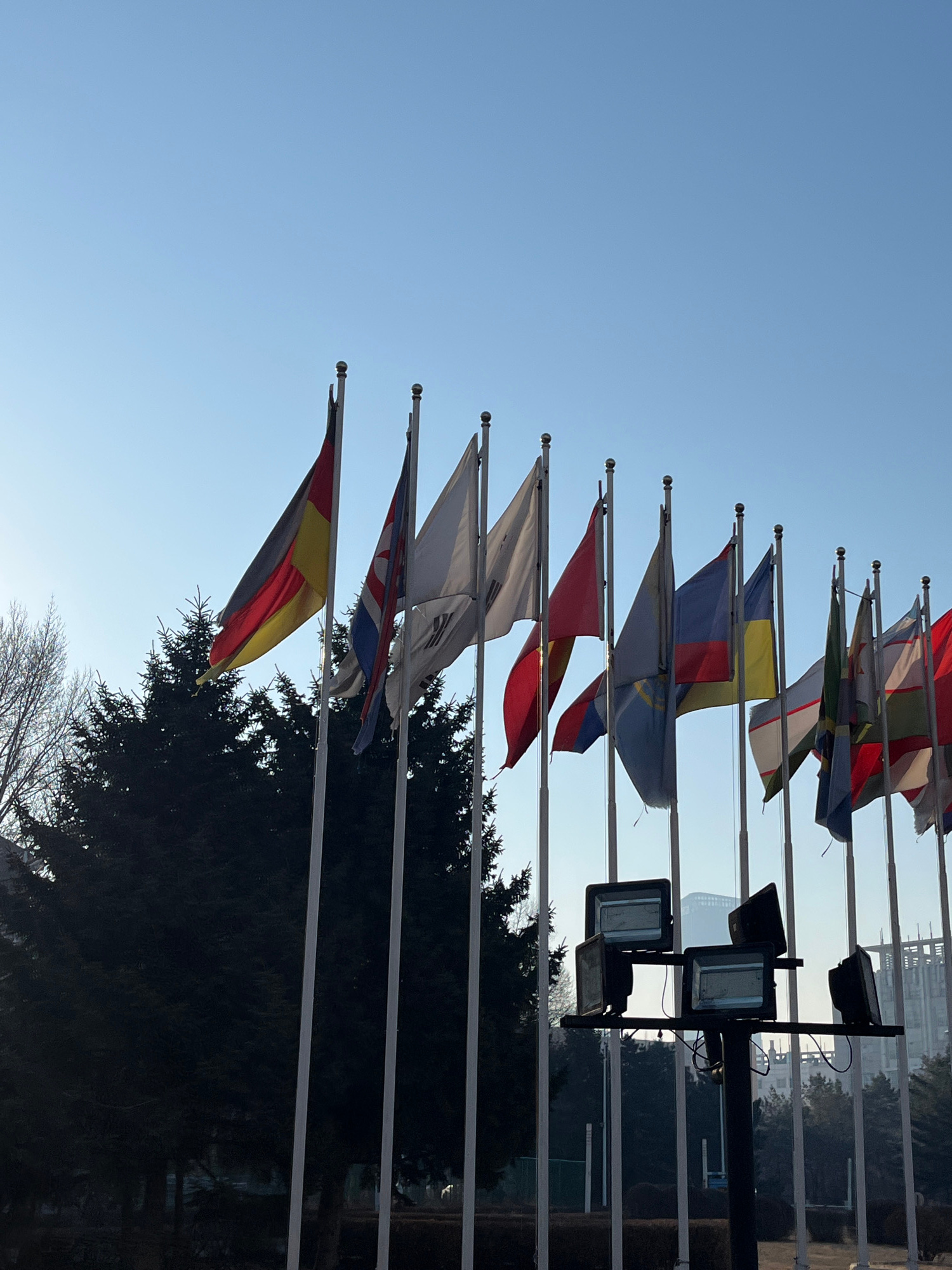 A photograph captures a series of international flags displayed on white poles. The flags are hanging limp in the absence of wind. Located behind the flags are street lights and trees, suggesting the…read more