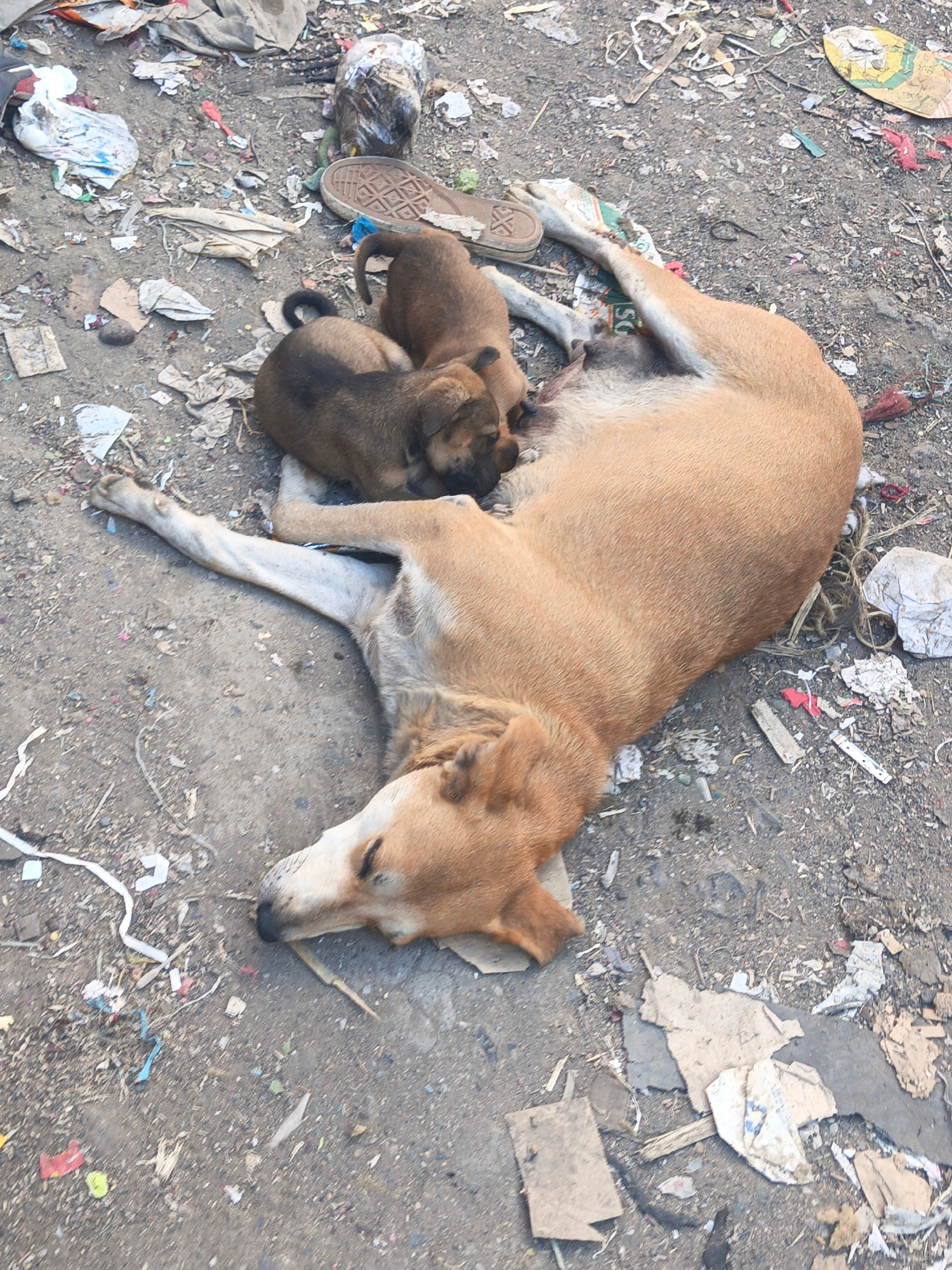 The image depicts a medium-sized, tan-colored dog lying on its side on a dirt and debris-covered surface. Two small puppies are nestled against the dog's underside, appearing to nurse. The dog appears…read more