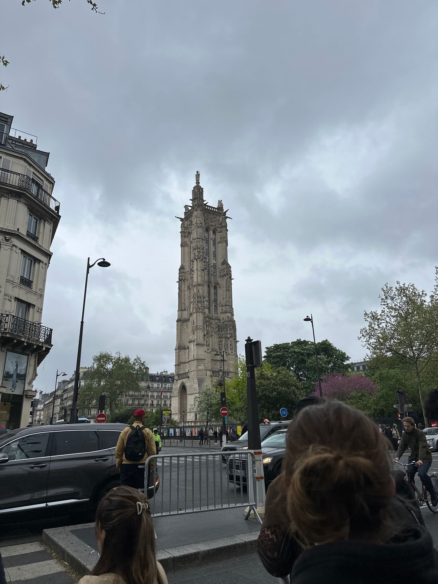 Here is a description of the image: The image shows the Tour Saint-Jacques in Paris, France on a cloudy day. The tower is the focal point, a tall and ornate structure. Street-level views include Pari…read more