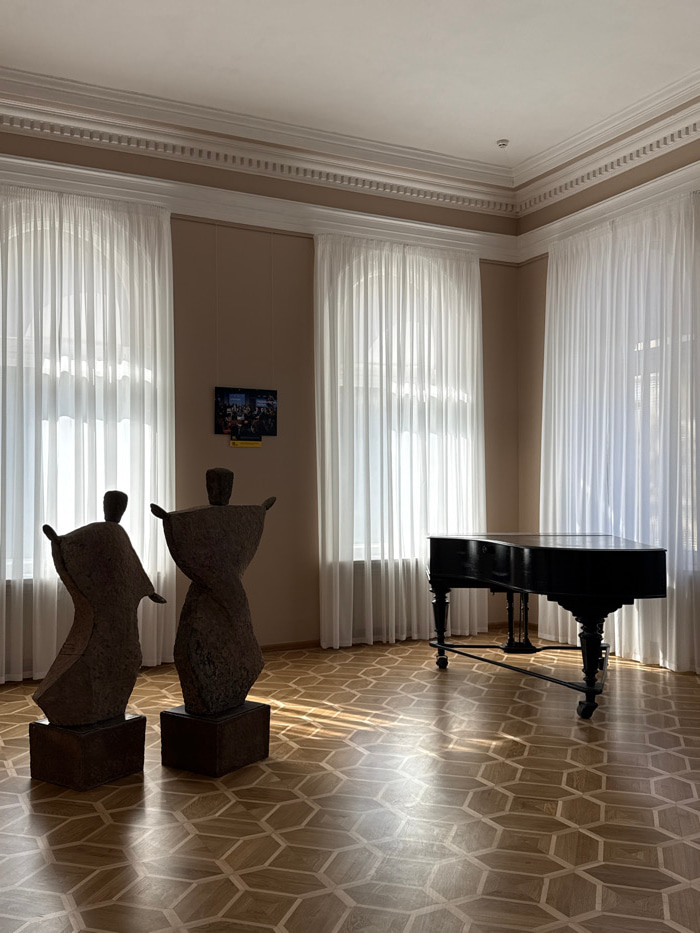 The image depicts an interior view of a room within the National Art Museum of Ukraine in Kyiv. The room features high ceilings and light beige walls adorned with elaborate white crown molding. Three…read more