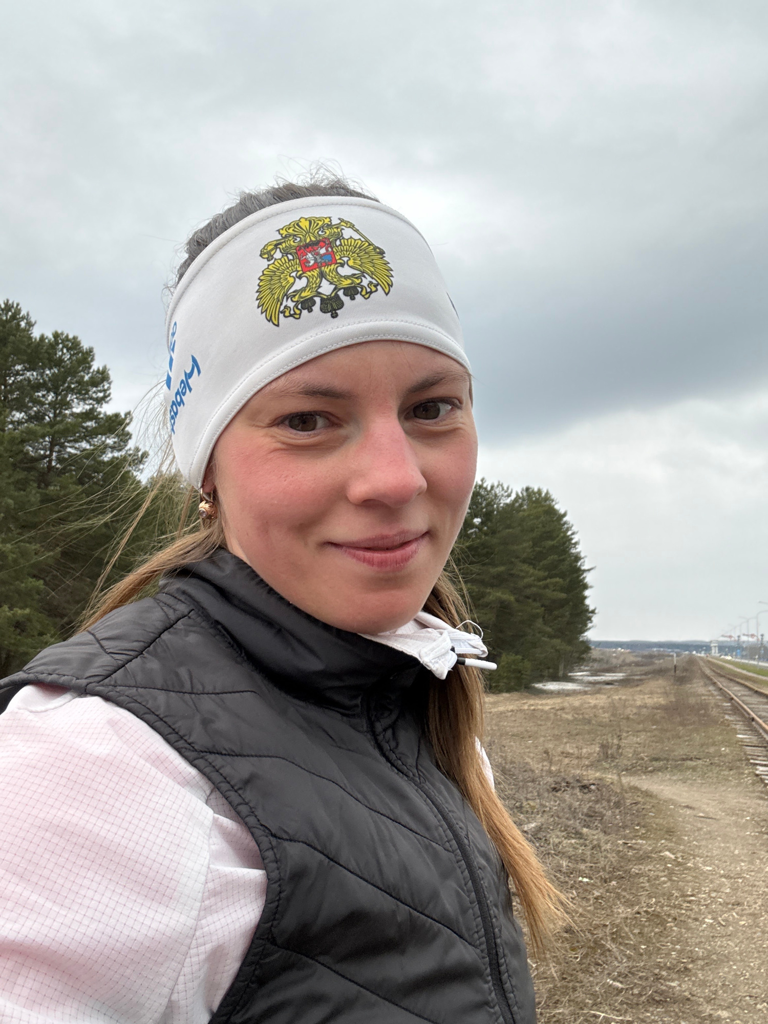 A woman is shown from the shoulders up, oriented vertically, smiling slightly. She wears a white headband with a prominent Russian coat of arms and the text "Hebasto" in blue. She is wearing a black v…read more