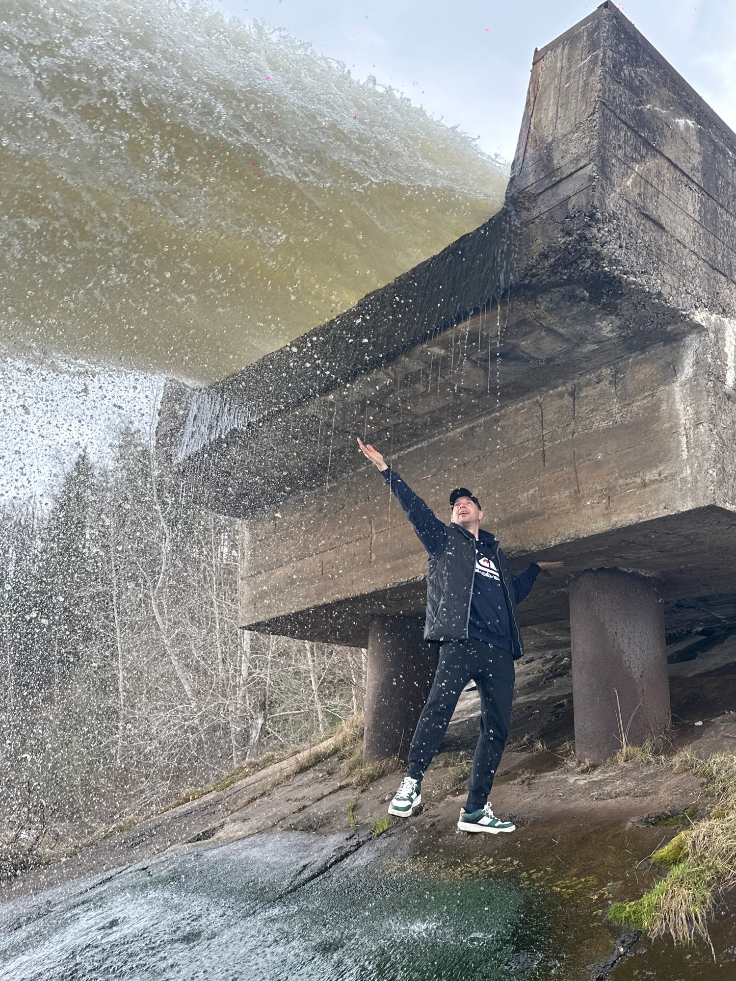 A rotated medium shot depicts a man standing under a concrete structure near a waterfall. The man, wearing a black cap, black jacket, and patterned pants, is positioned with his arms outstretched. His…read more