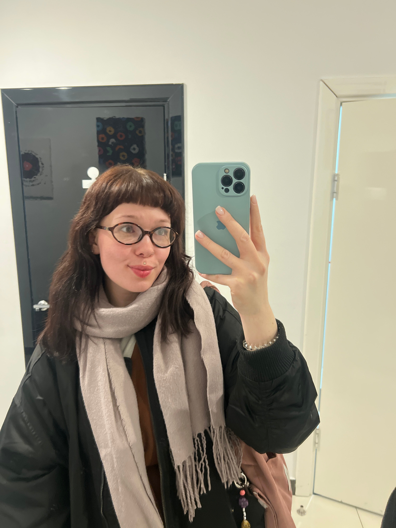A young woman is captured in a mirror selfie, holding a light blue/mint green iPhone with three visible camera lenses and an Apple logo on its back. The image is rotated 90 degrees clockwise. The wom…read more