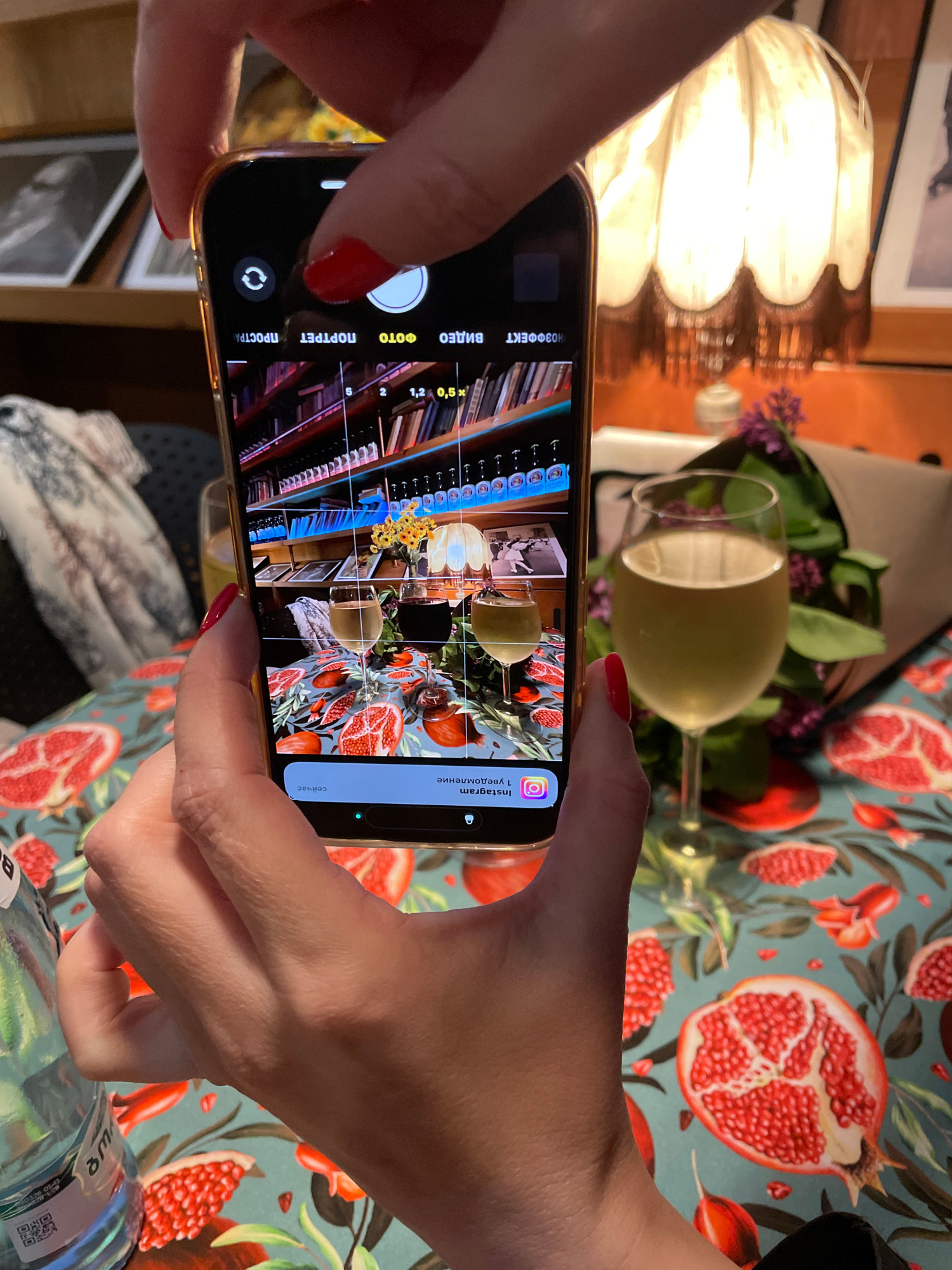 The scene depicts a person taking a photograph with a smartphone of a table setting. The table is covered with a patterned tablecloth featuring pomegranates. On the table, there is a wine glass filled…read more