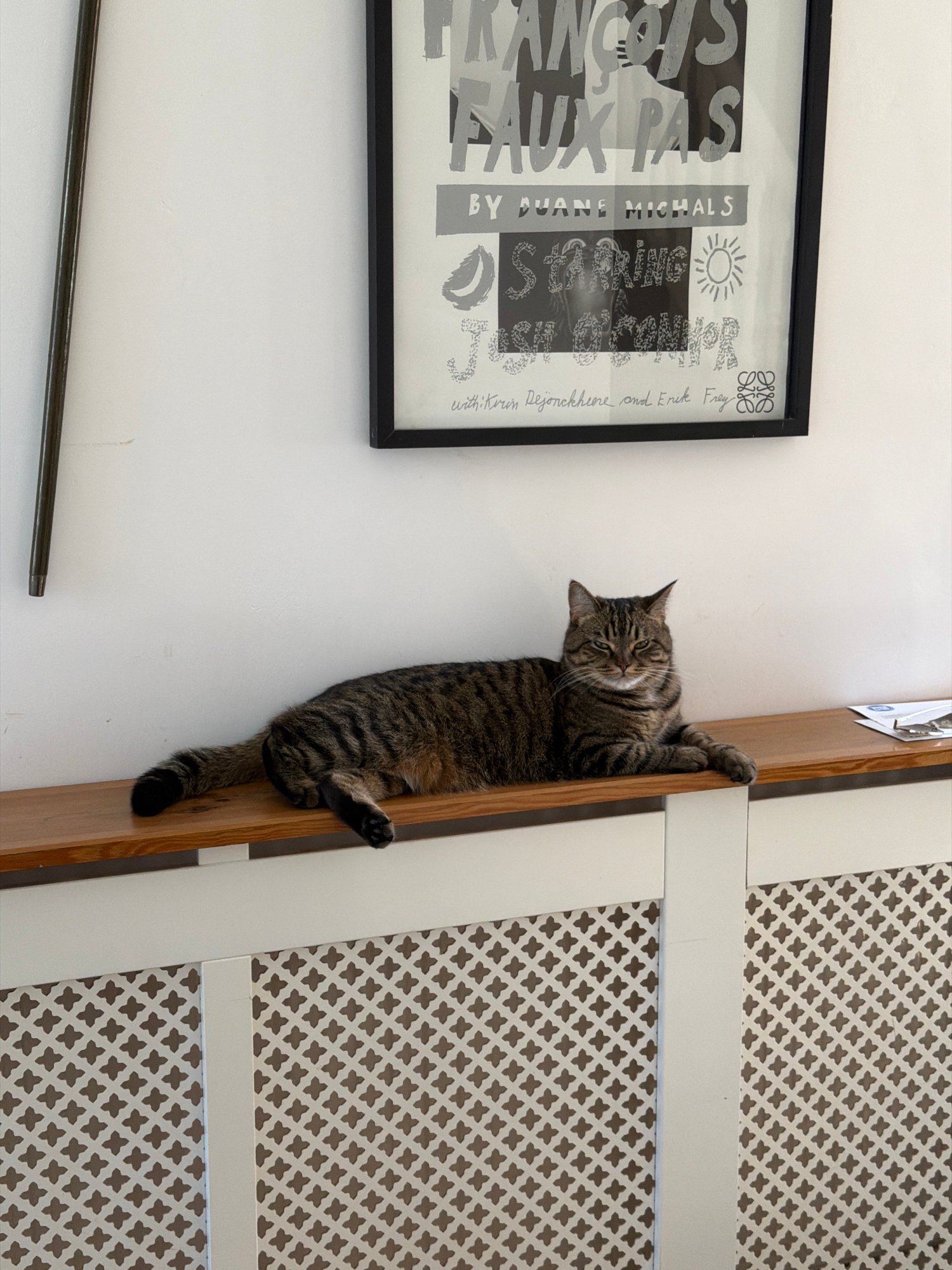 A tabby cat is clinging to the side of a wooden door or room divider, appearing to hang vertically. The cat's face is visible, and its body extends downwards along the vertical edge of the wooden stru…read more