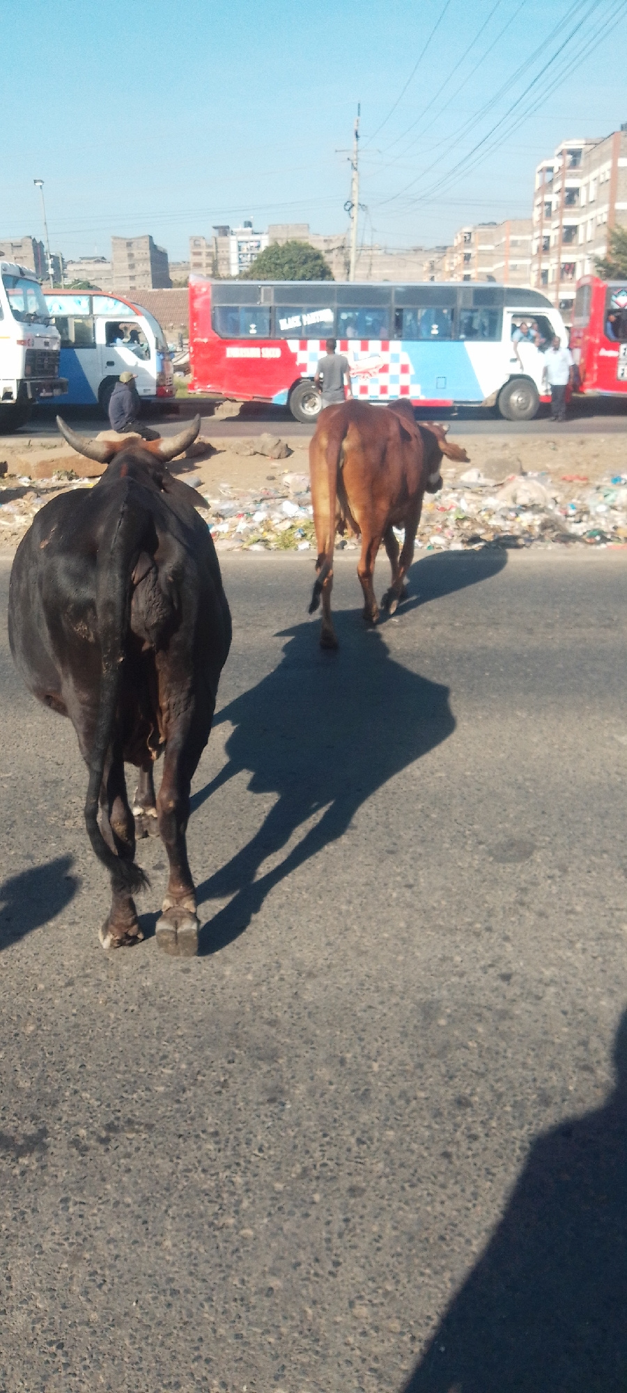 The image captures a street scene in Nairobi, Kenya. Two cows, one black and one brown, are walking away from the viewer down the center of a paved road. The black cow is closer to the camera, reveali…read more