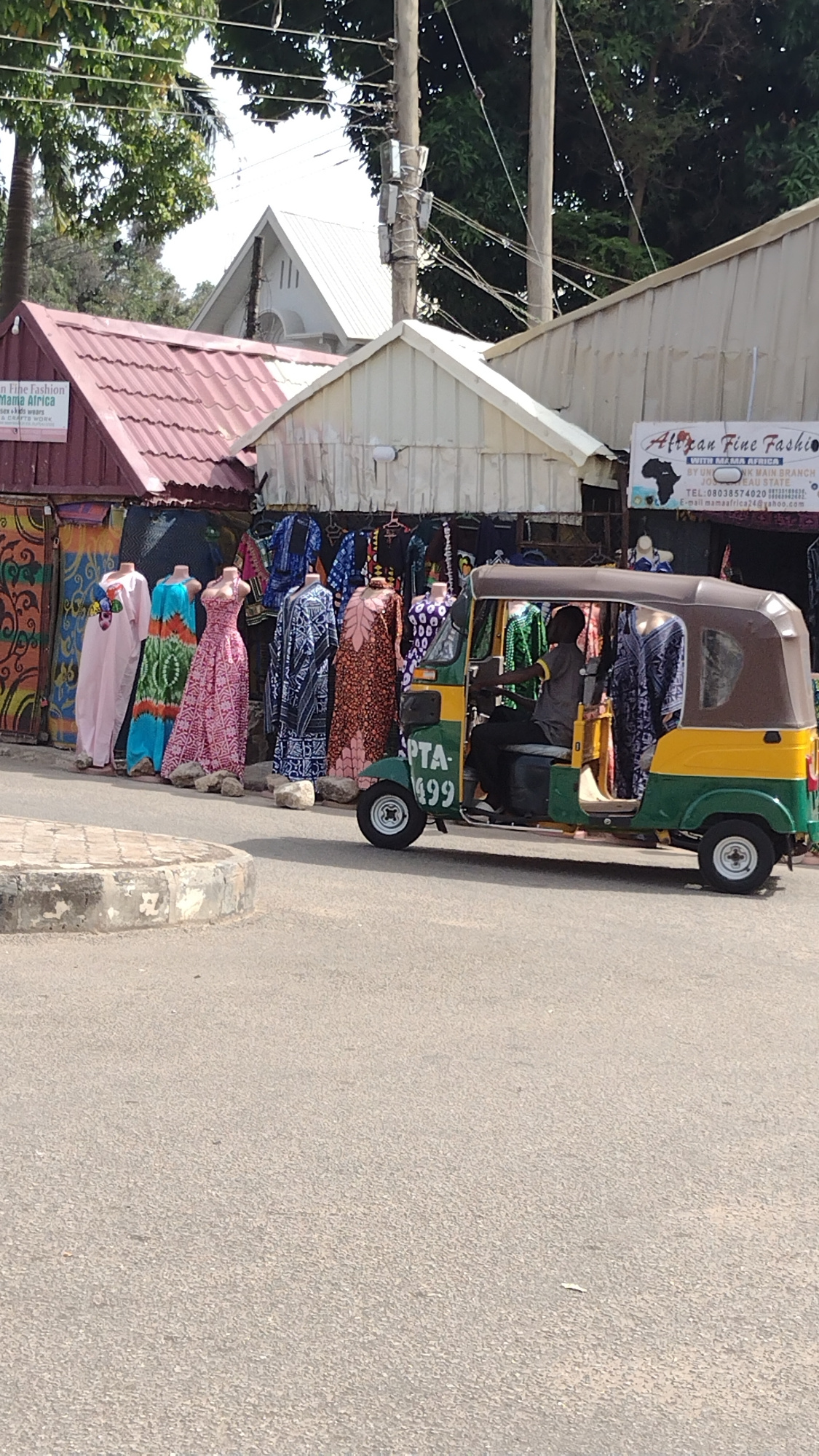 Here is a description of the image: The image shows a roadside shop in Jos, Nigeria called "African Fine Fashion." The shop sells Mama Africa textiles and features mannequins displaying colorful dres…read more