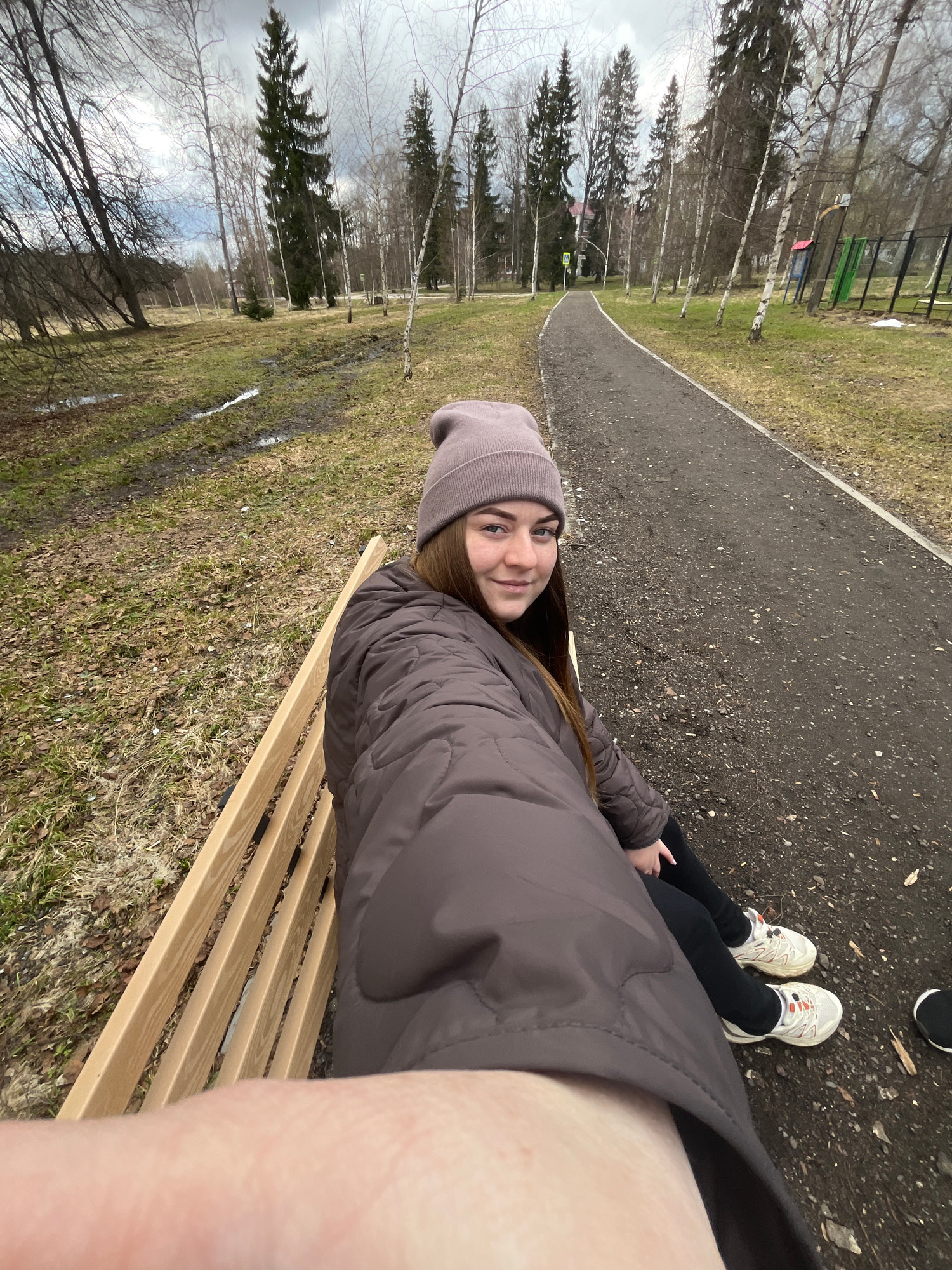 A young woman sits on a wooden bench along a paved path in a park, likely in Vysokovsk, Russia. The woman is wearing a gray beanie, a brown puffer jacket, and black pants. She has white sneakers on he…read more