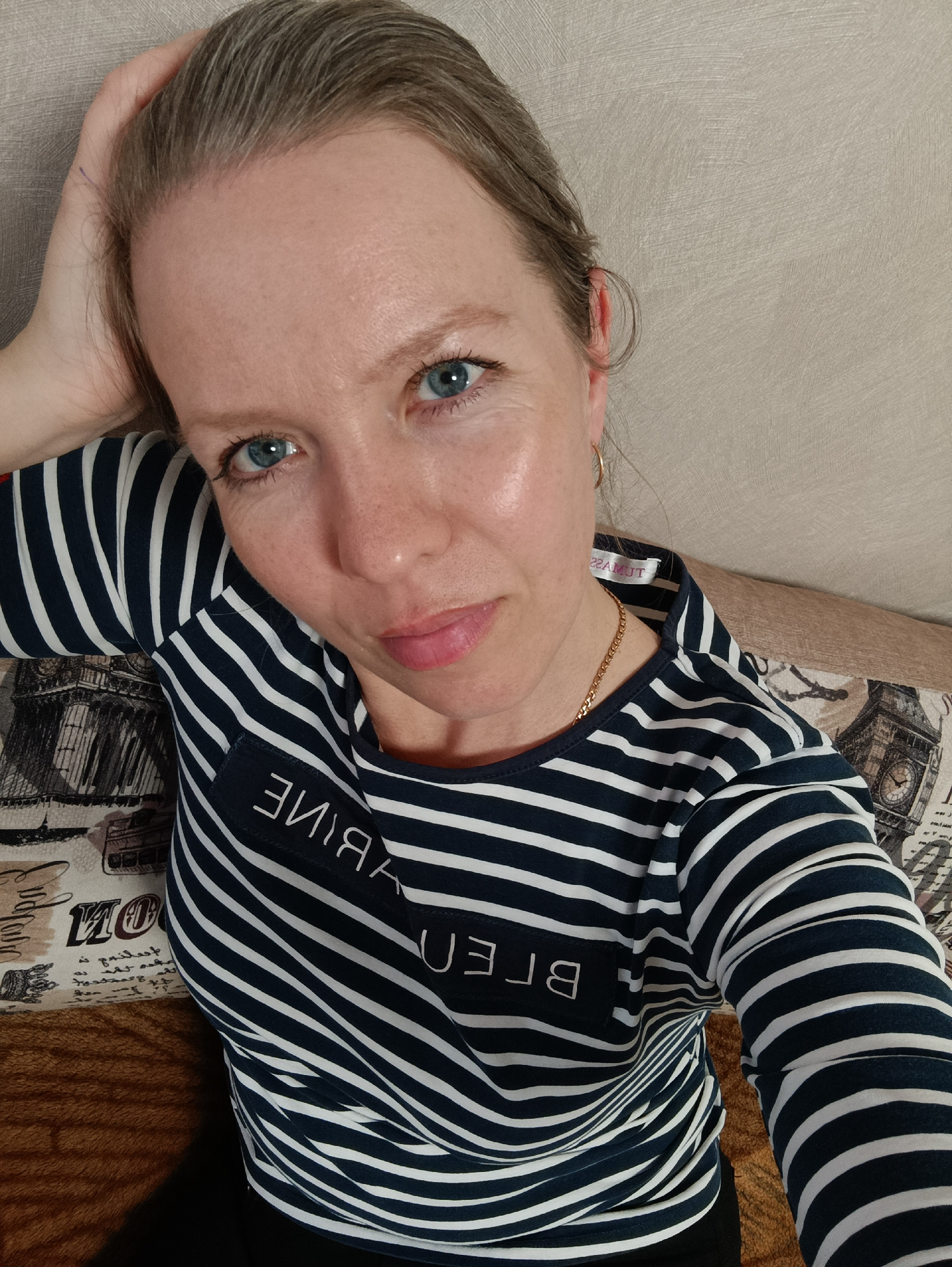 The image captures a close-up, eye-level indoor selfie of a woman taken in Chaikovsky, Russia. She has light skin, prominent blue eyes, and light brown or blonde hair styled loosely. She looks directl…read more
