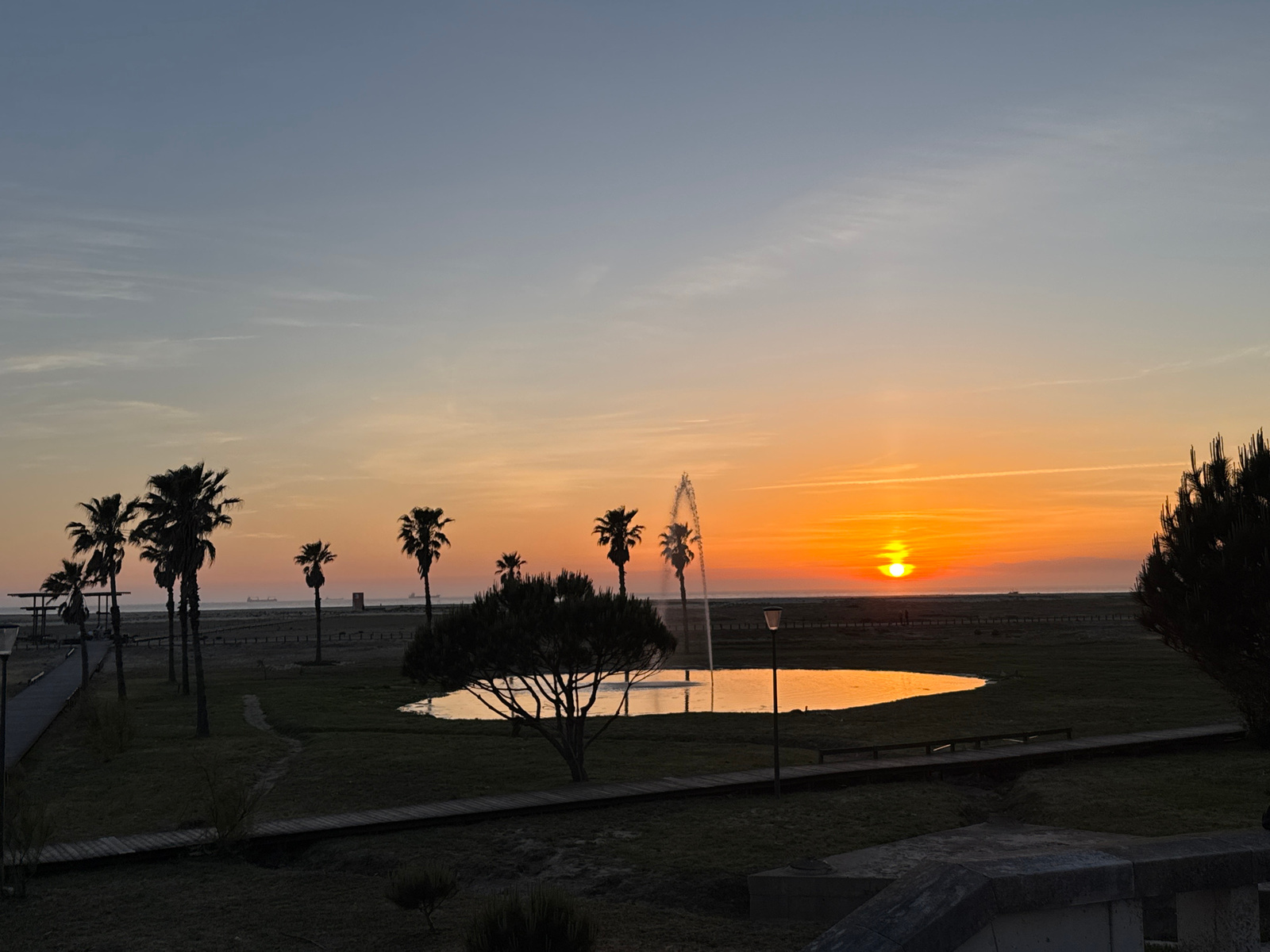 The image depicts a sunset scene in Figueira da Foz, Portugal. The sun is setting on the horizon, casting an orange glow across the sky and reflecting on the water. A body of water with a central foun…read more