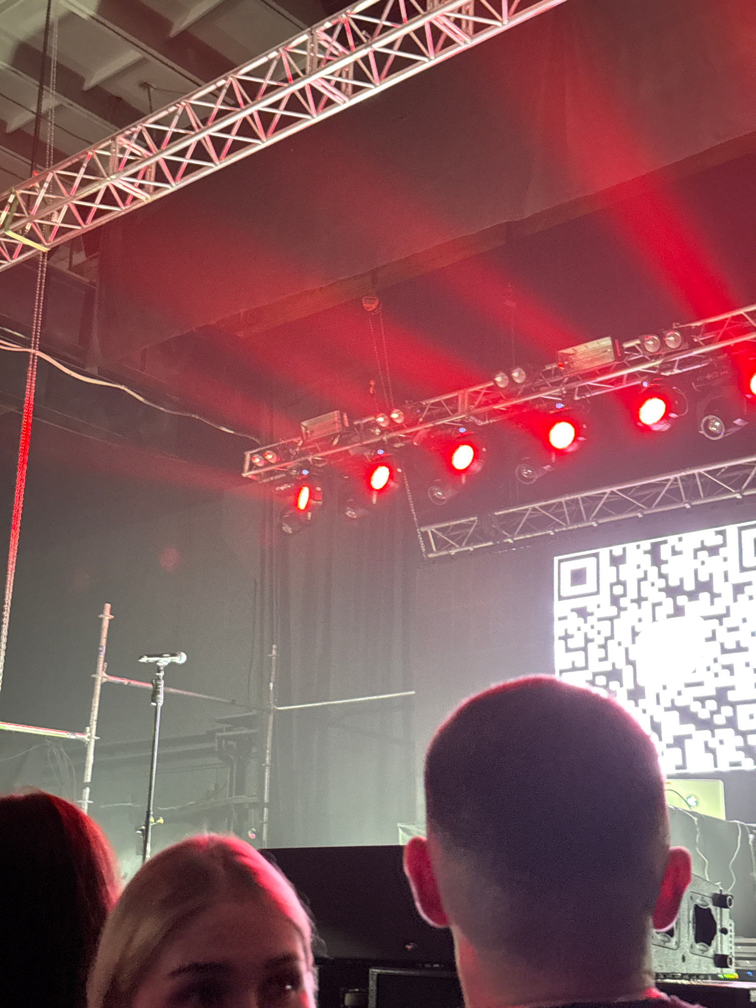 The image captures an indoor event, likely a concert or performance, characterized by dramatic red lighting. The perspective is from a low angle, looking upwards towards the stage or ceiling infrastru…read more