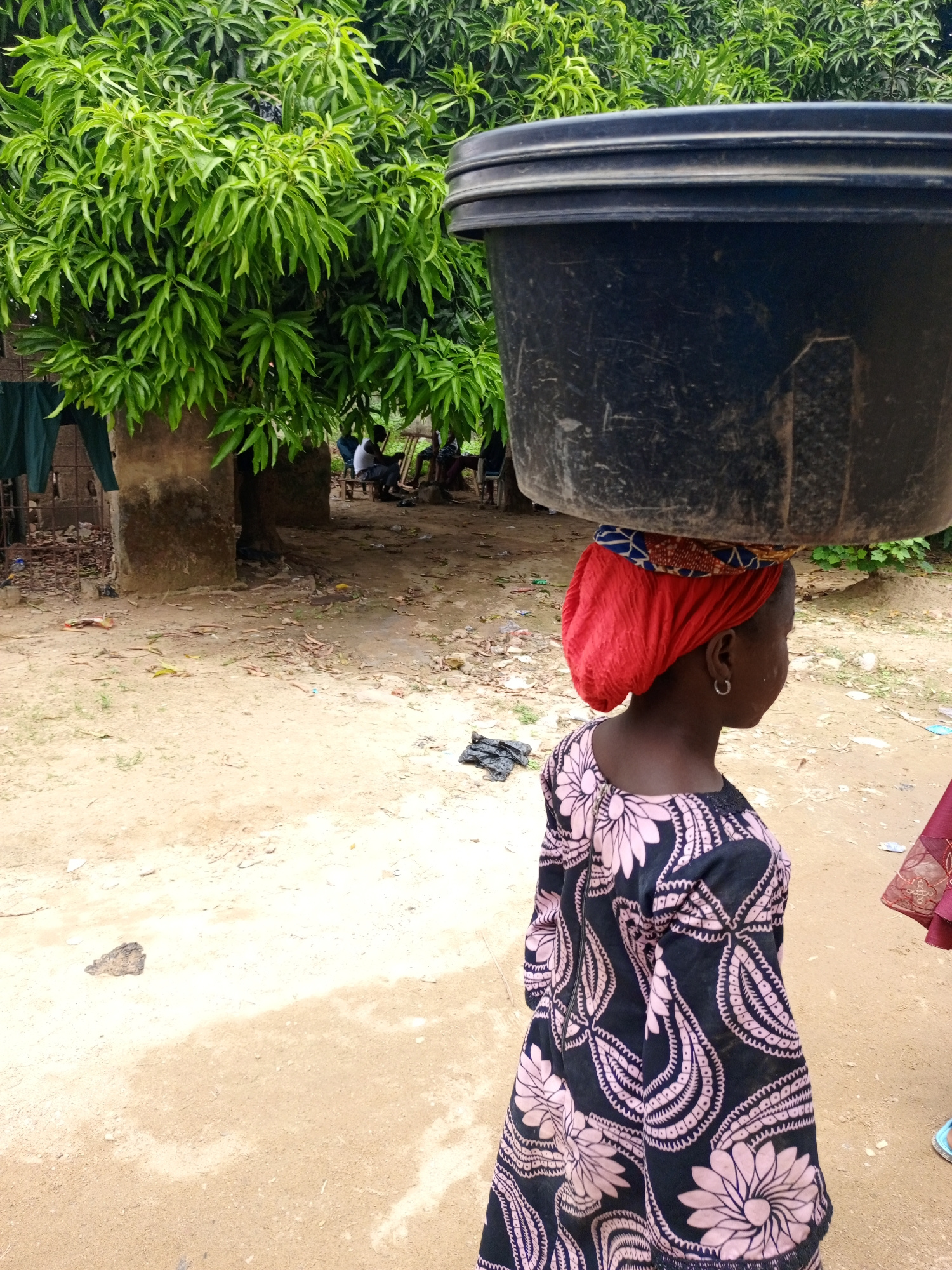 The image depicts a young girl in Keffi, Nigeria, carrying a large black bucket on her head. She is wearing a red headscarf and a black dress with a pink floral pattern. The background includes a dirt…read more