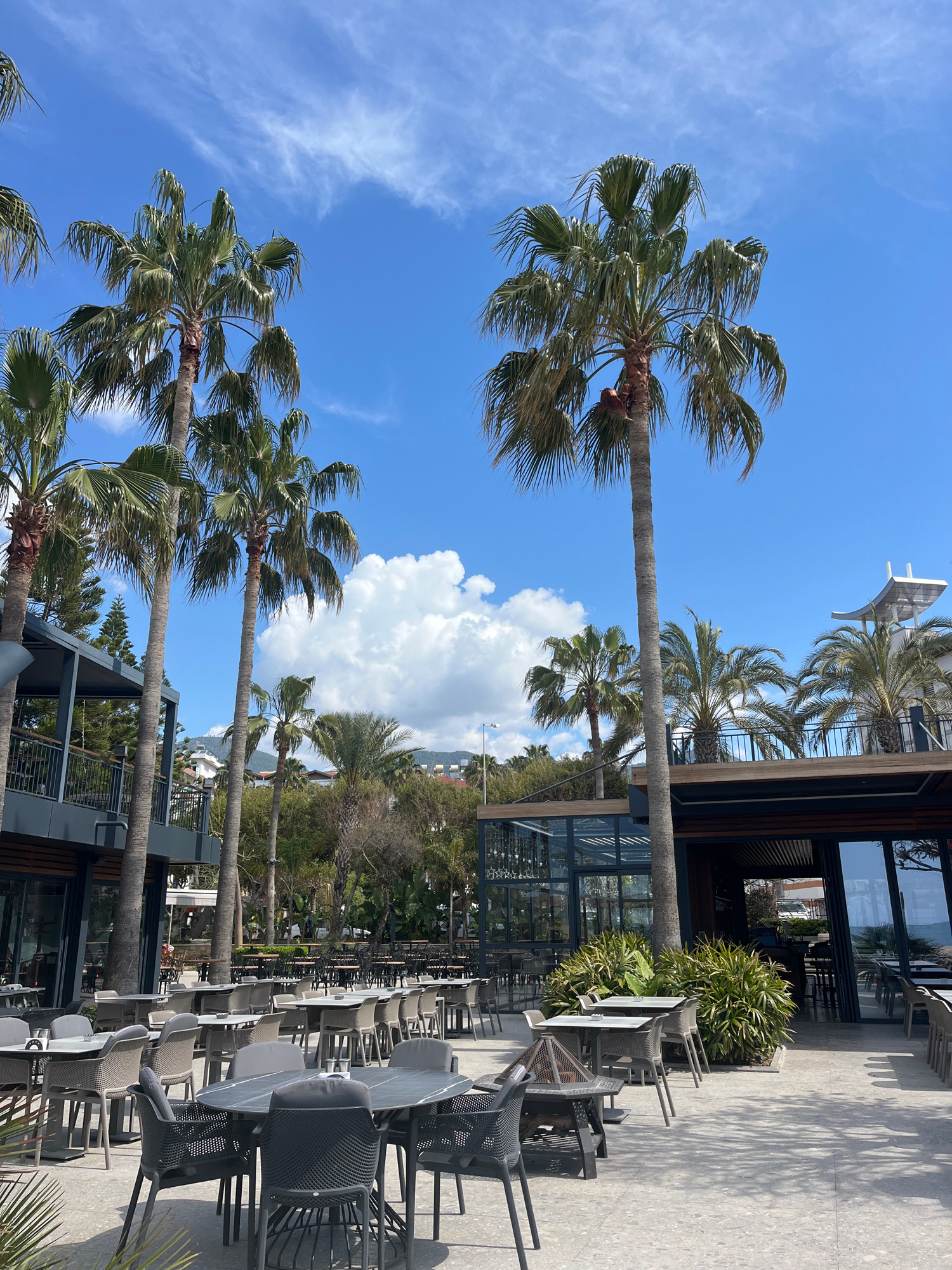 The image shows an outdoor dining area with numerous tables and chairs, located in Alanya, Turkey, as palm trees are visible in the background. The location seems to be adjacent to a modern building w…read more