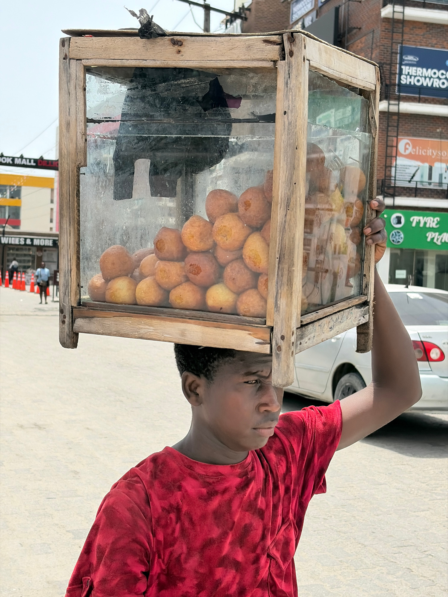 The image depicts a young man in Alaguntan, Nigeria, wearing a red t-shirt. He is standing on a paved surface, likely a sidewalk, and appears to be selling puff-puff (a type of fried dough snack) from…read more