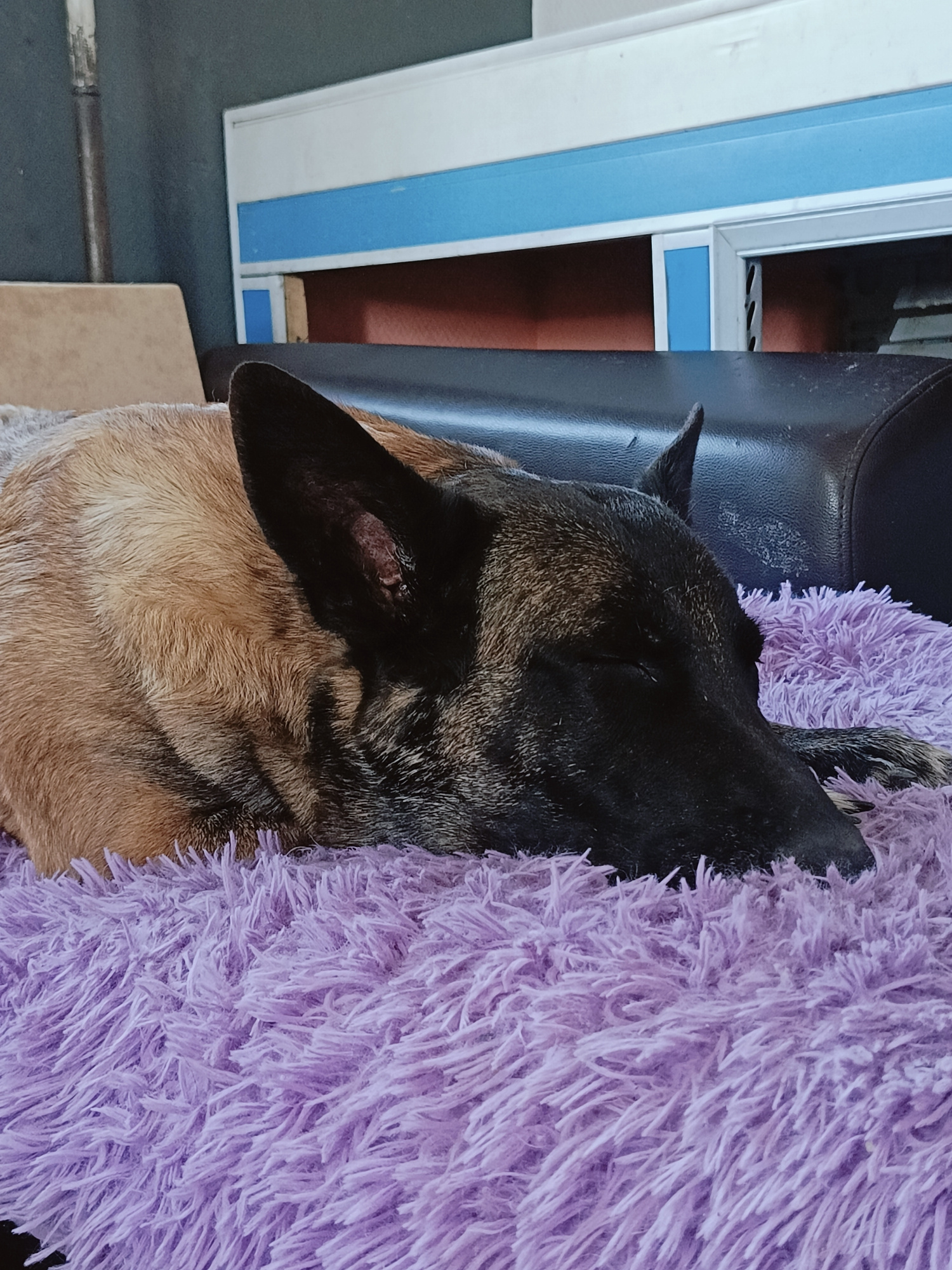 An overhead shot captures a tan and black dog, likely a Belgian Malinois or a similar shepherd breed, soundly asleep or resting. The dog is positioned on a vibrant, fluffy purple blanket, which coversβ¦read more