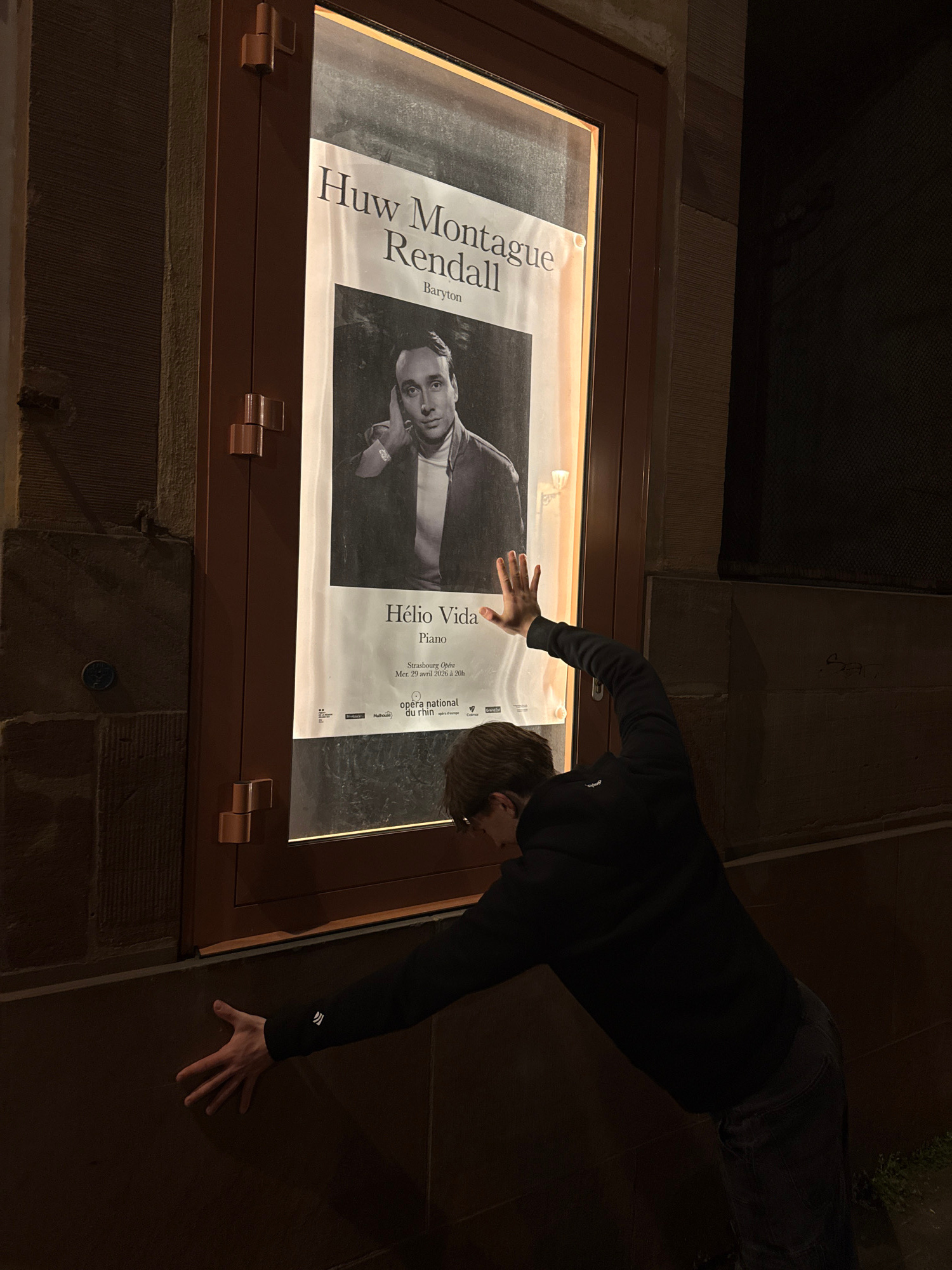 The image shows a person in a black hoodie and dark pants leaning over a poster displayed in a glass-fronted display case. The poster advertises a performance featuring Huw Montague Rendall (Baryton)…read more