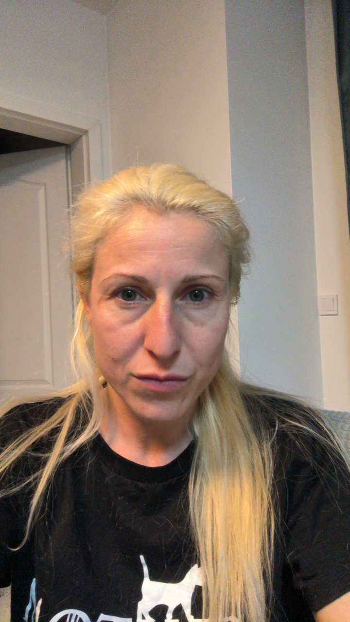 The video shows two cats in a room with white tiled flooring. Initially, a black cat with striking yellow eyes looks directly at the camera. The perspective then shifts, revealing a gray tabby cat sitβ¦read more