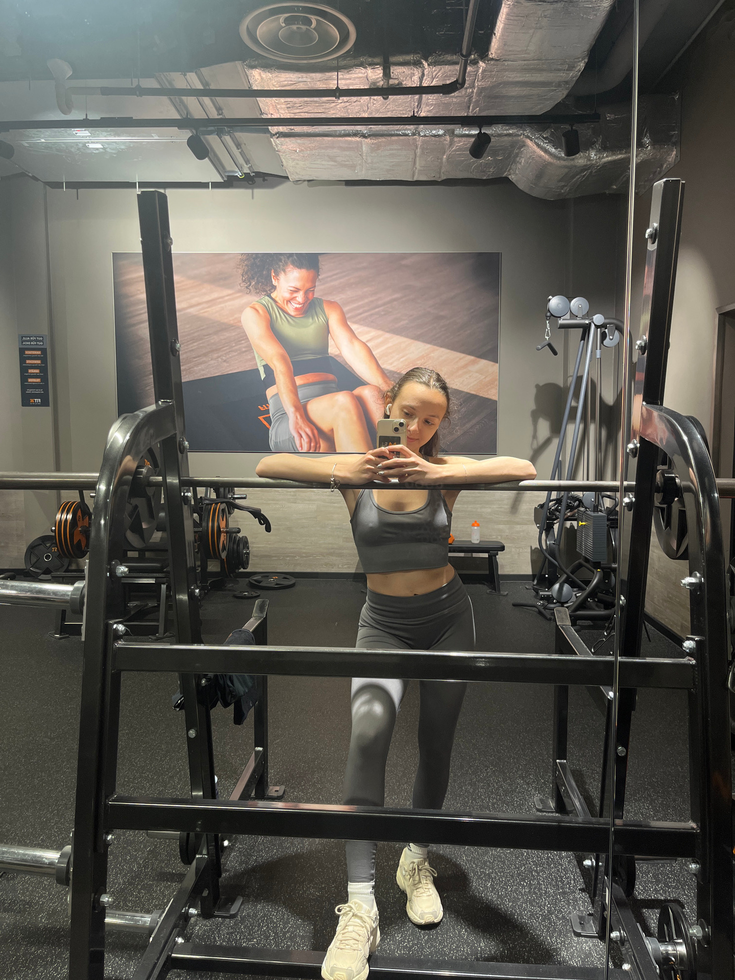 A woman in a gray exercise outfit stands in front of a Smith machine, using her phone to capture her reflection in the equipment's mirror. The scene is a gym, indicated by exercise equipment. Behind h…read more