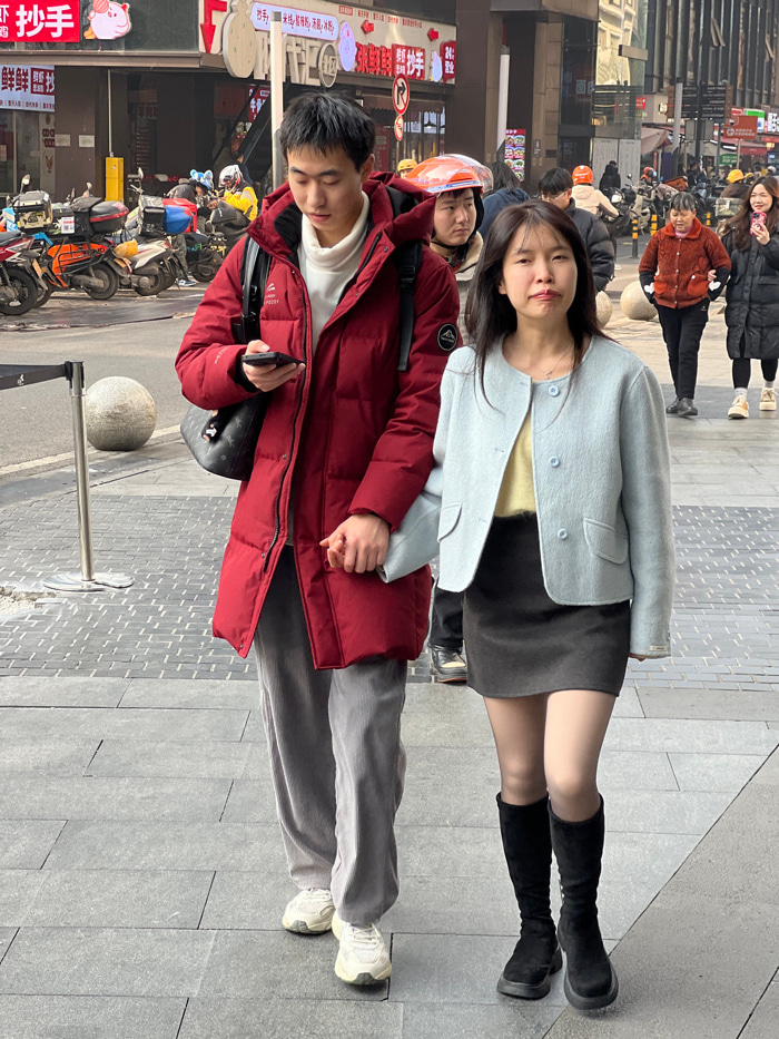 The image, oriented sideways, captures two young adults on a paved urban street or sidewalk, likely in Yuzhong District, China, with other pedestrians and buildings in the background. In the foregrou…read more
