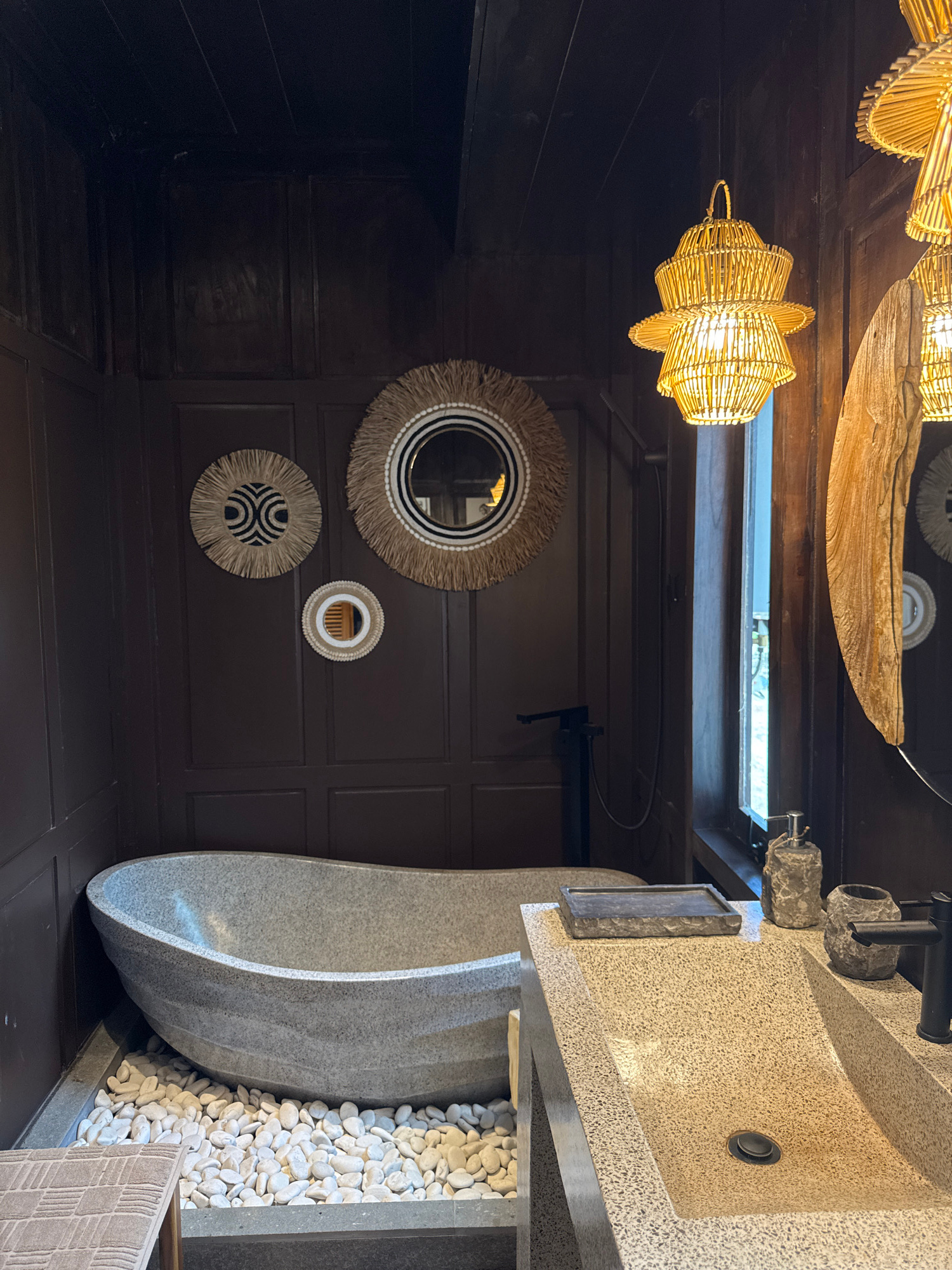 This is an interior shot of a bathroom in Ungasan, Indonesia. The walls are a dark brown, and there are three decorative circular mirrors hanging on one wall, each with a different pattern. The ceilin…read more