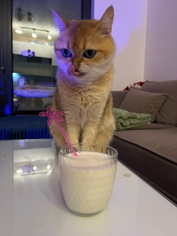 A golden cat with blue eyes licks its lips near a glass of a white beverage, adorned with a pink palm tree stirrer. The scene is set on a white table, with a glimpse of a sofa in the background and a…read more