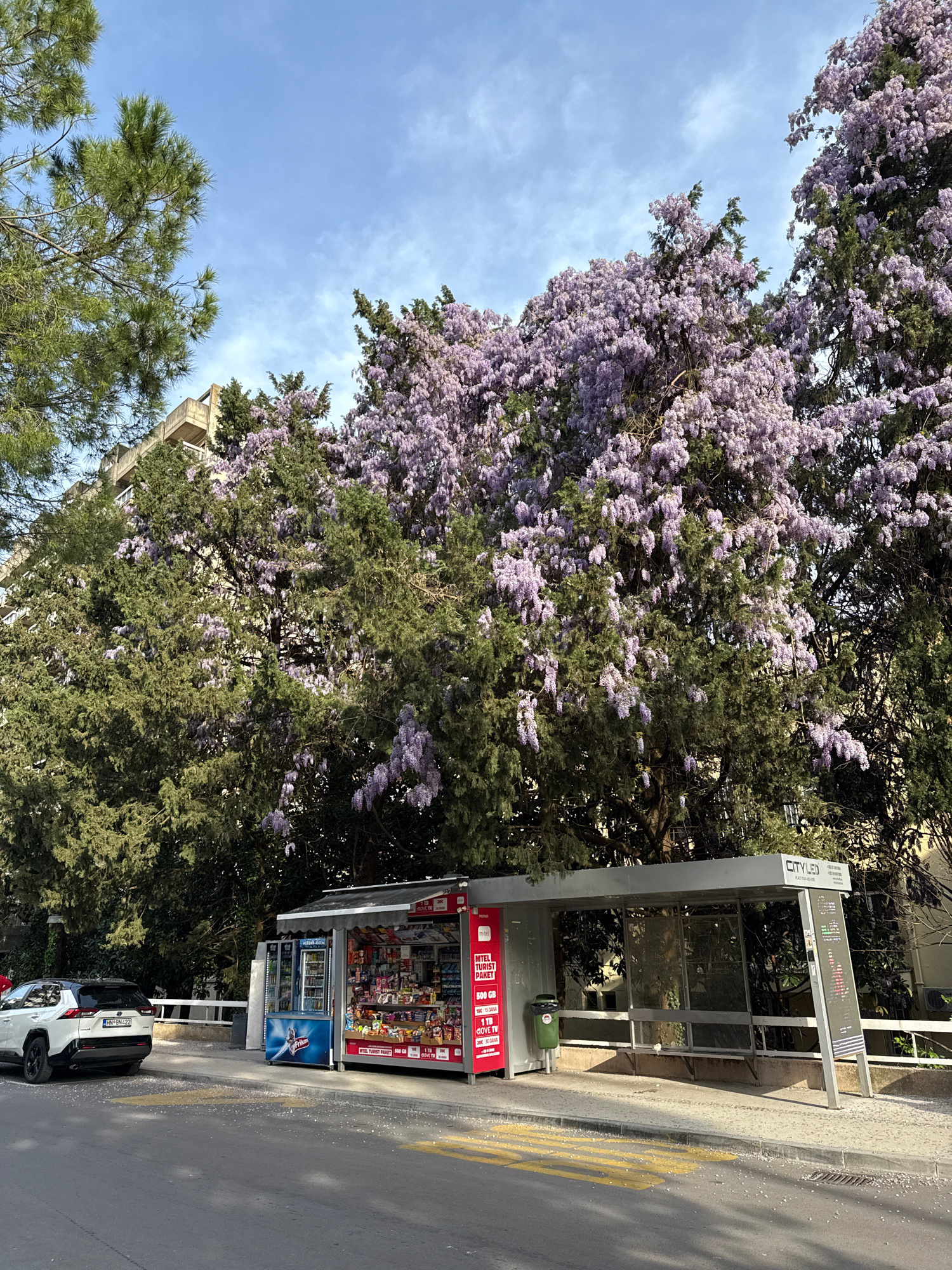 The image depicts a street scene in Igalo, Montenegro, dominated by a large tree with lavender-colored blossoms. A bus stop is visible on the right side of the frame, featuring a small newsstand attac…read more