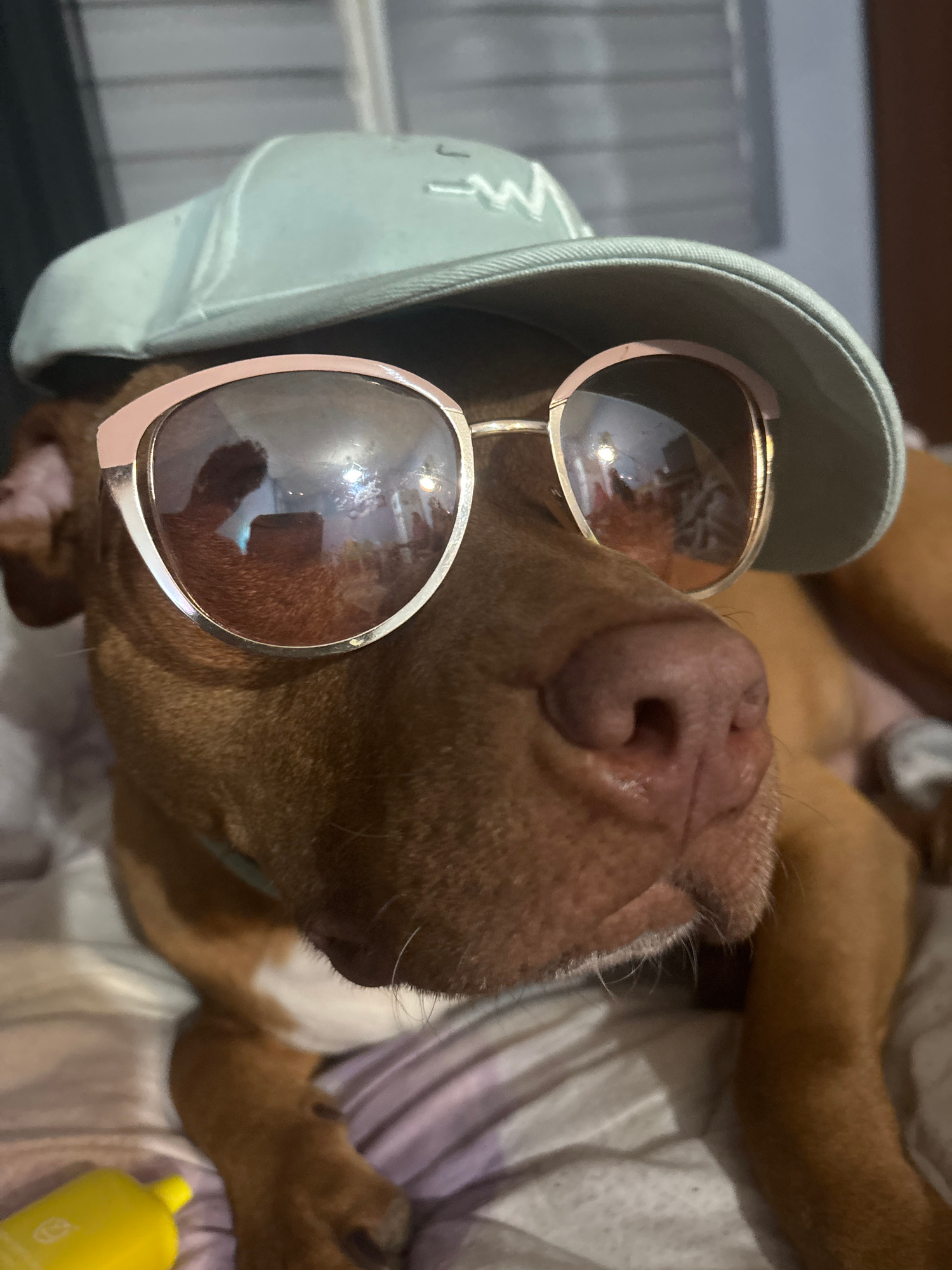 A dog wearing sunglasses and a hat is lying down. The dog is brown with a pink nose. The sunglasses have round frames. The hat is light blue. The dog is on a patterned surface. A yellow object is also…read more