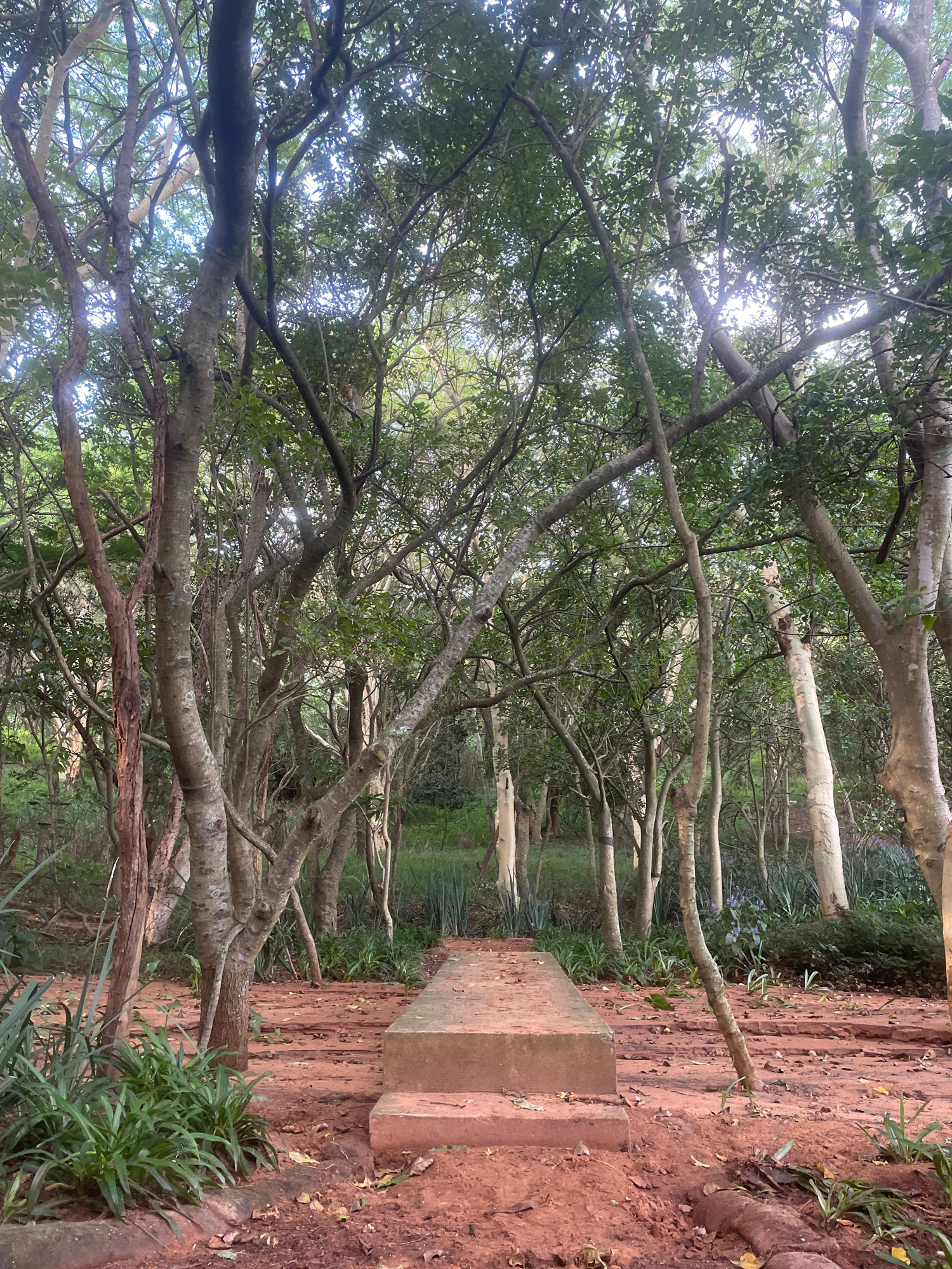 The image depicts a view along a path within a wooded area, possibly a park or nature reserve. The perspective is from ground level, looking forward along the path. The path is constructed of reddish-…read more