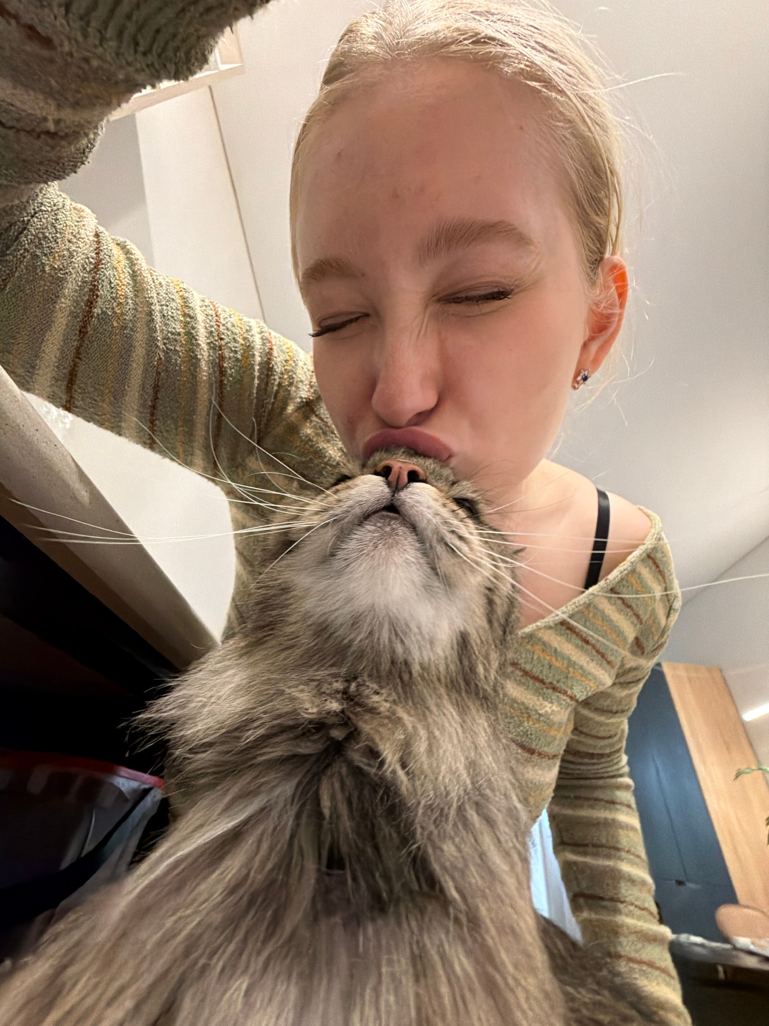 A woman with light blonde hair and closed eyes is kissing a gray, long-haired cat. The woman wears a striped sweater and a black choker necklace. The background is blurry but includes a light-colored…read more