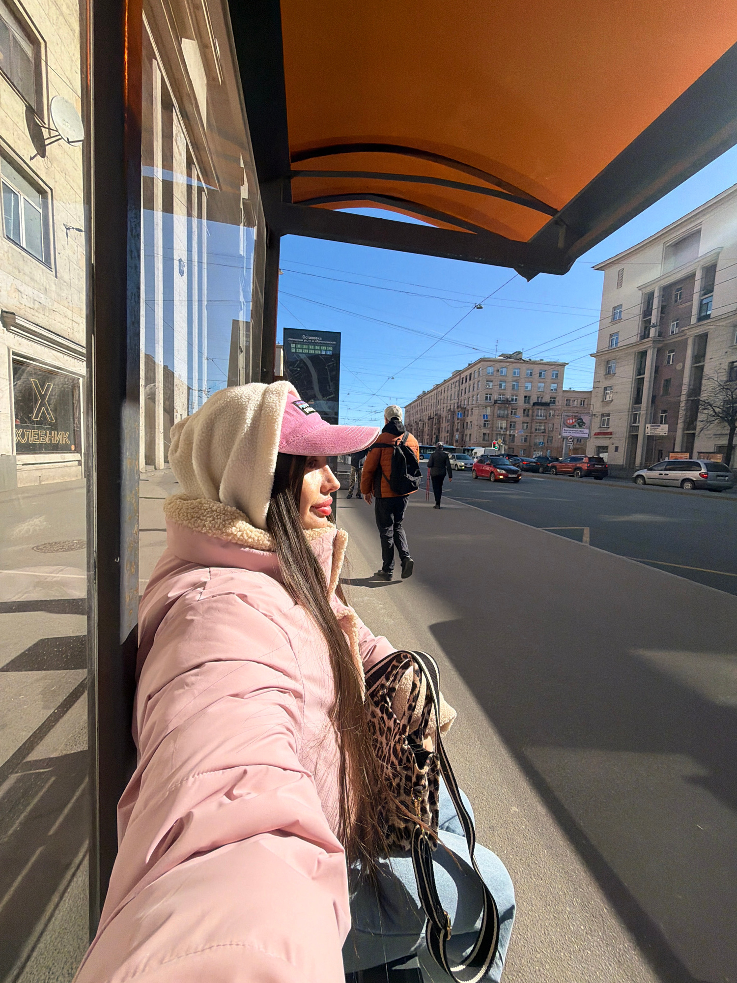 The image depicts a young woman at a bus stop in Saint Petersburg, Russia. She is wearing a pink hooded coat and a pink baseball cap, standing beside a pane of glass at a bus stop. Reflected in the gl…read more