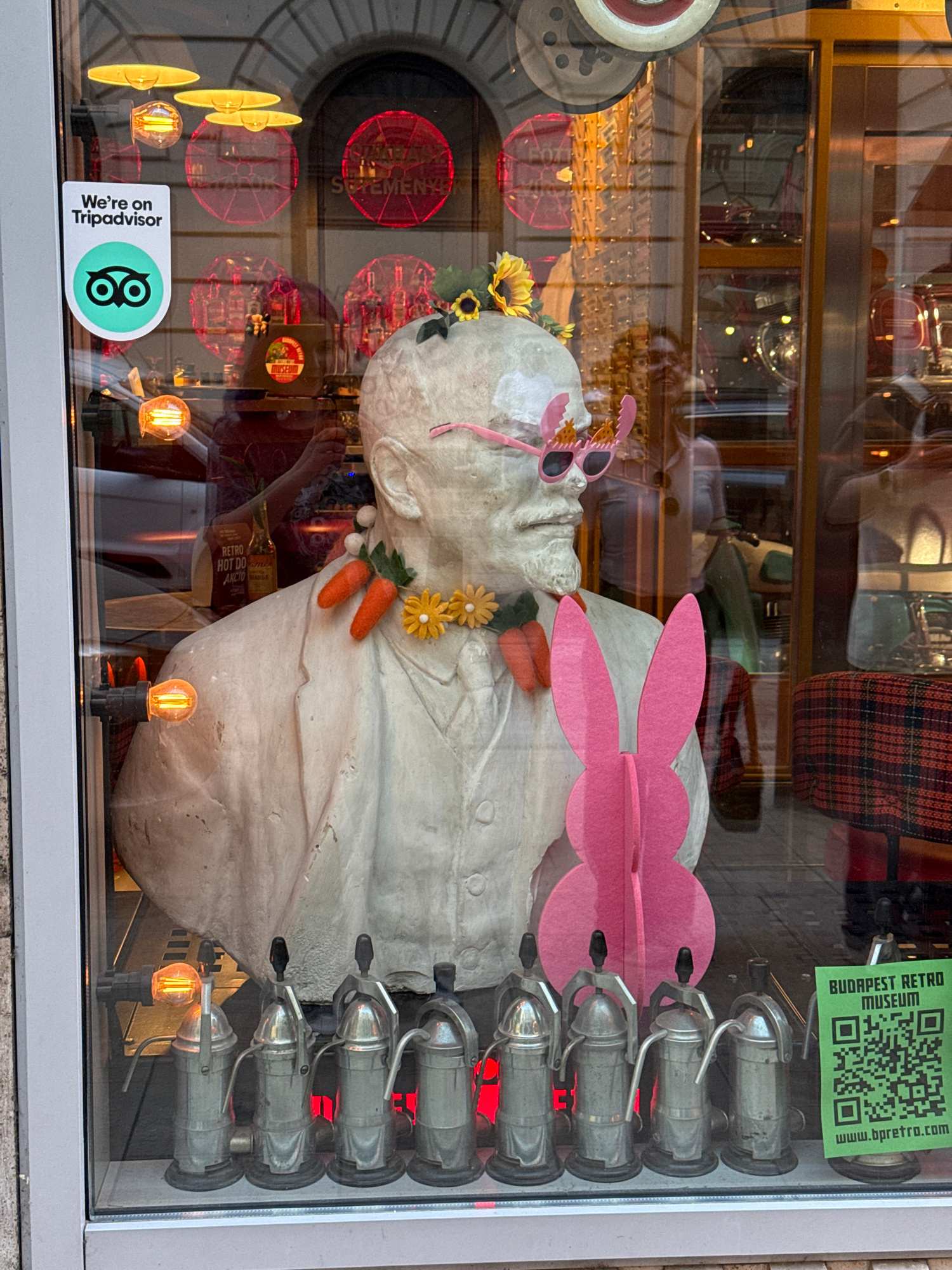 The image shows a storefront window display in Budapest, Hungary, specifically for the "Budapest Retro Museum", evidenced by a green sign with a QR code. The window displays a white bust of a head wea…read more