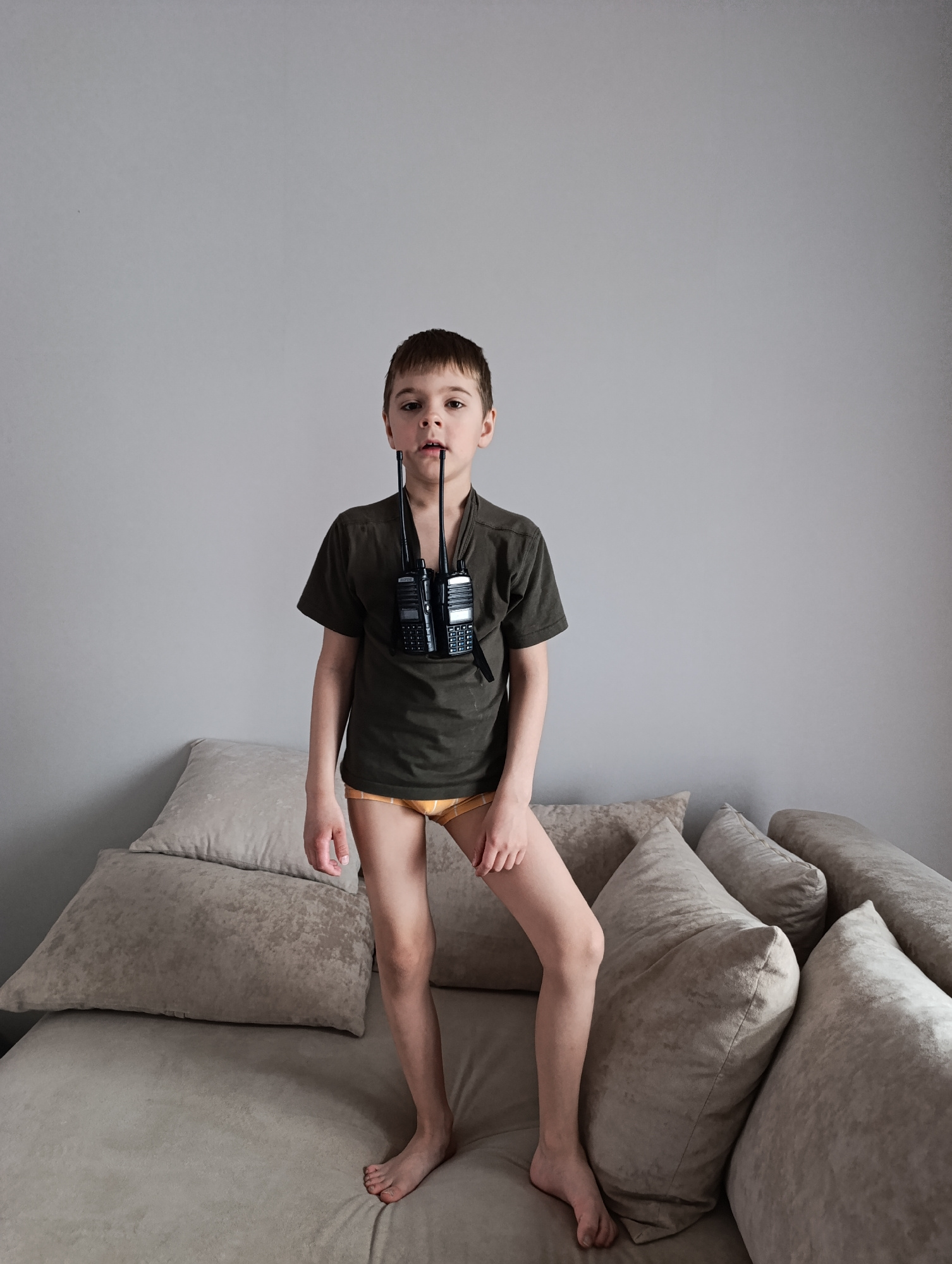 In an indoor setting, likely a home in Chaikovsky, Russia, a young boy is captured standing on a light-colored sofa or bed. He is barefoot and appears to be of elementary school age, with short brown…read more