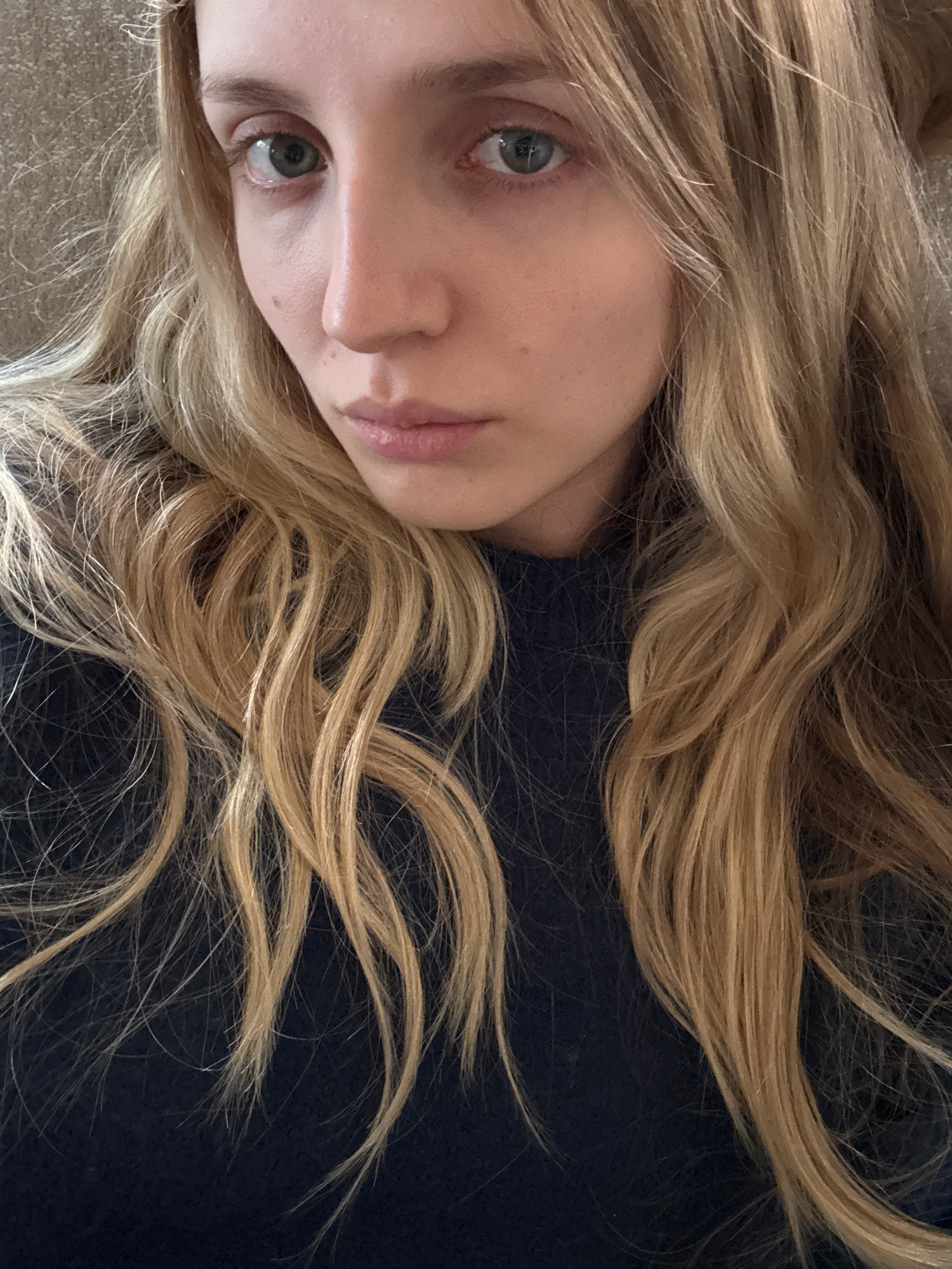 The image shows a woman lying down with her head turned to the side. Her hair is long, wavy, and blonde. She has fair skin, green eyes, and light pink lips. She is wearing a dark-colored shirt. The ba…read more