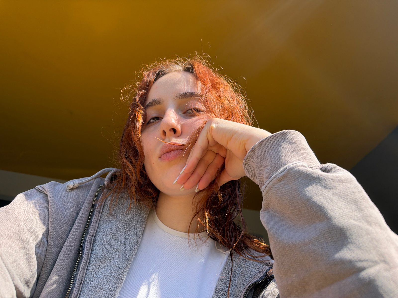 An upside-down, eye-level shot depicts a woman with reddish-brown, curly hair, fair skin, and long fingernails wearing a white t-shirt and gray zippered sweatshirt. Her hand is raised to her face, parβ¦read more
