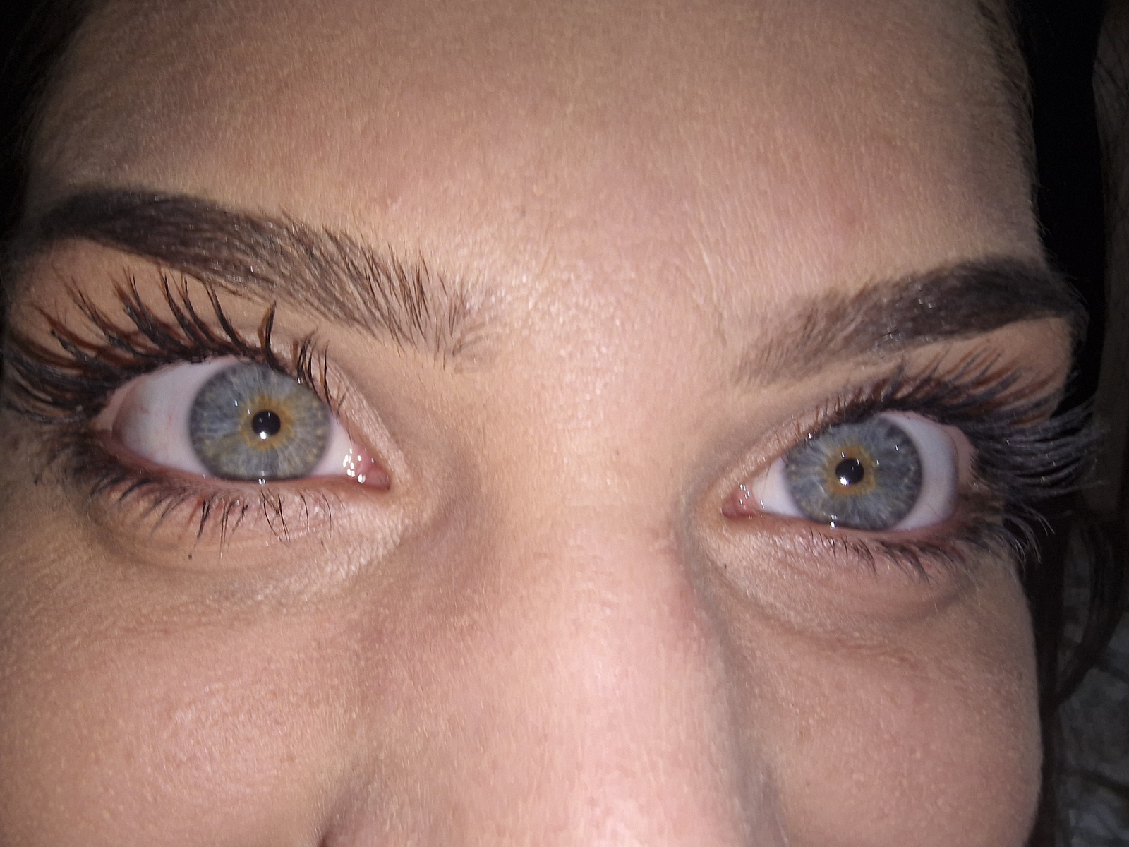 A close-up photograph depicts a woman's face, focusing on her eyes and the surrounding area. Her skin tone appears fair with visible pores and textures. She has well-defined eyebrows with individual h…read more