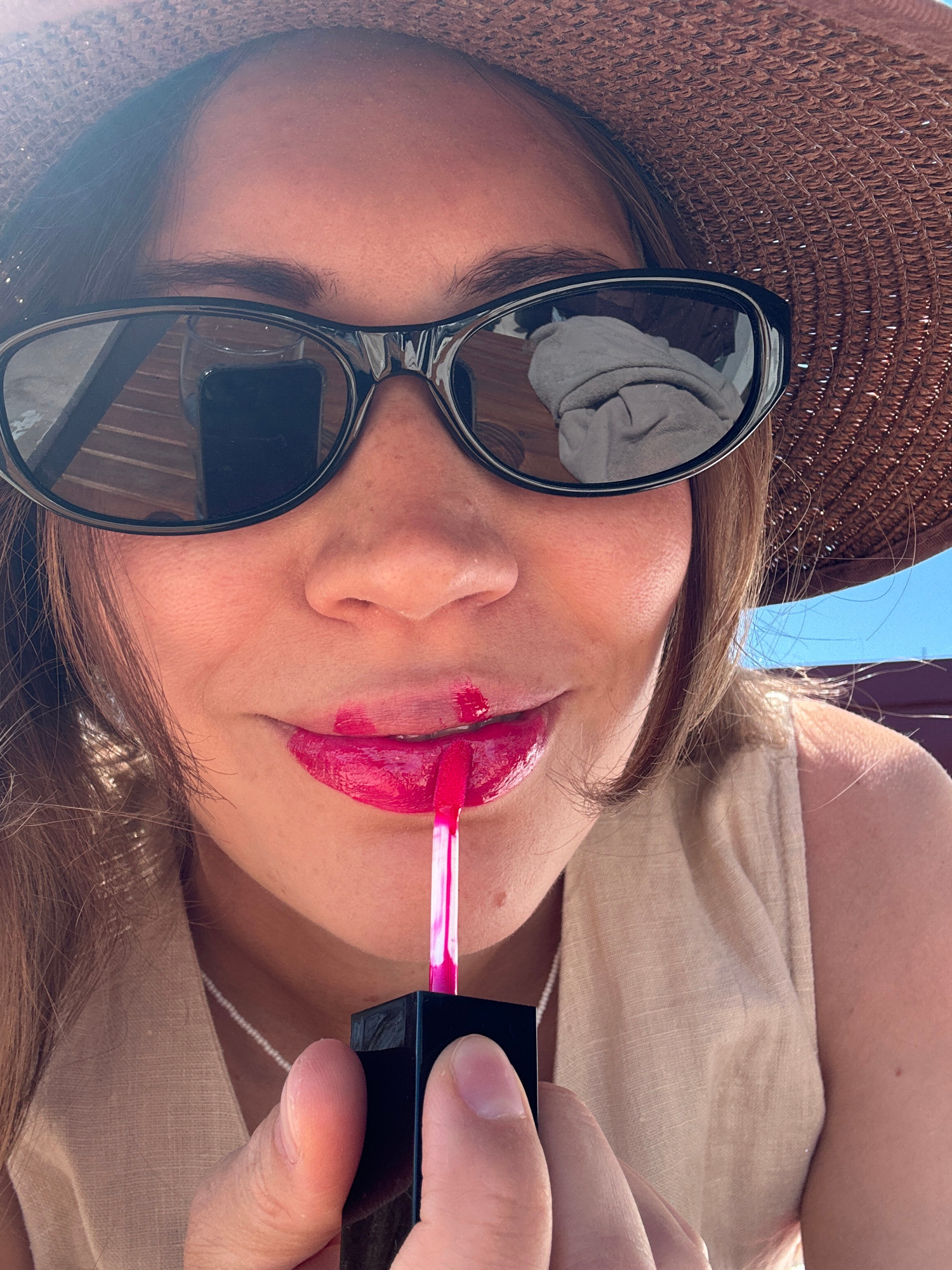 A close-up, angled forensic image shows an individual applying bright fuchsia liquid lipstick in Fethiye, Turkey. The subject wears a wide-brimmed brown straw hat and dark, oval-shaped sunglasses. Ref…read more