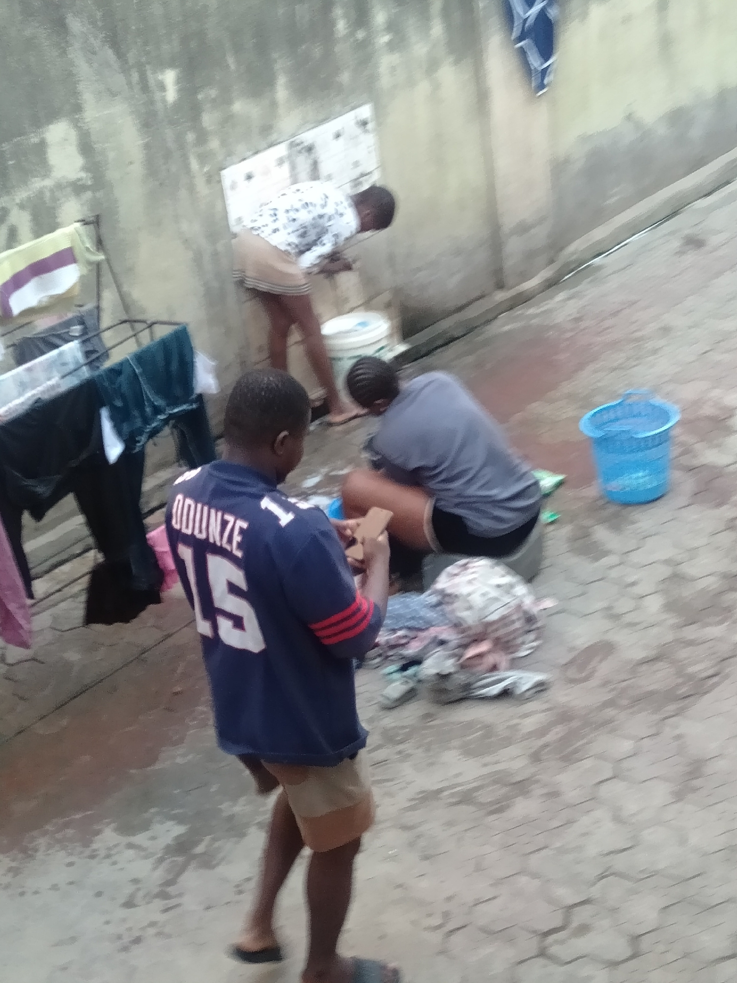 The image depicts an outdoor domestic scene in Shangisha, Nigeria, likely in a backyard or courtyard, characterized by a paved, wet hexagonal tiled ground and a rough, light-colored concrete wall in t…read more