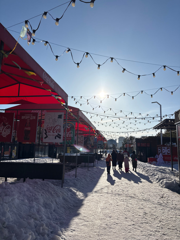 The image presents an outdoor winter market scene located at the former EXPO-2017 grounds in Astana, Kazakhstan. The spherical Nur-Alem Pavilion is discernible in the distant background. A cleared pat…read more