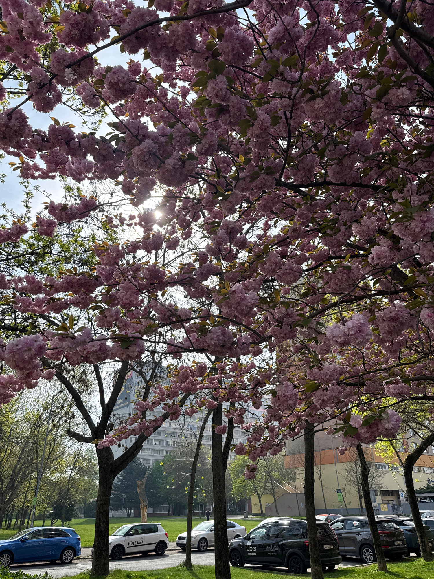 The image captures a street in Bratislava, Slovakia, lined with flowering trees, most likely cherry blossoms, in full bloom. The pink blossoms fill the top portion of the frame, with sunlight filterinβ¦read more