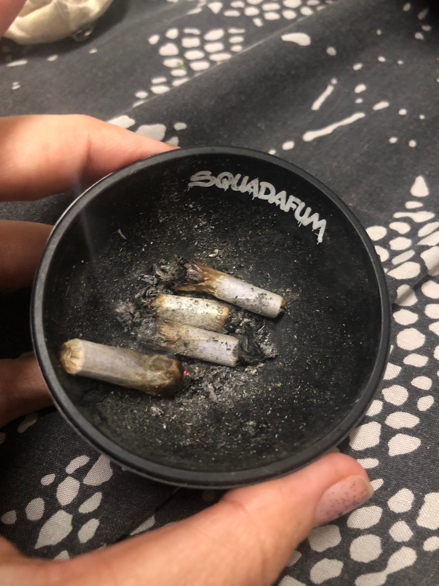 A close-up shot shows a black ashtray held in someone's hands. Inside the ashtray are three smoked marijuana joints. The ashtray has the word "Squadafum" written on the side. The background is a patteβ¦read more