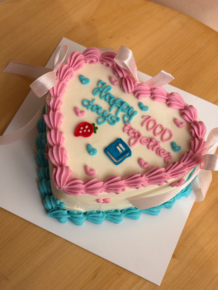 A close-up, high-angle image depicts a heart-shaped cake resting on a white square cake board. The cake is predominantly covered in white frosting. A border of pink piped frosting in a shell or ruffle…read more