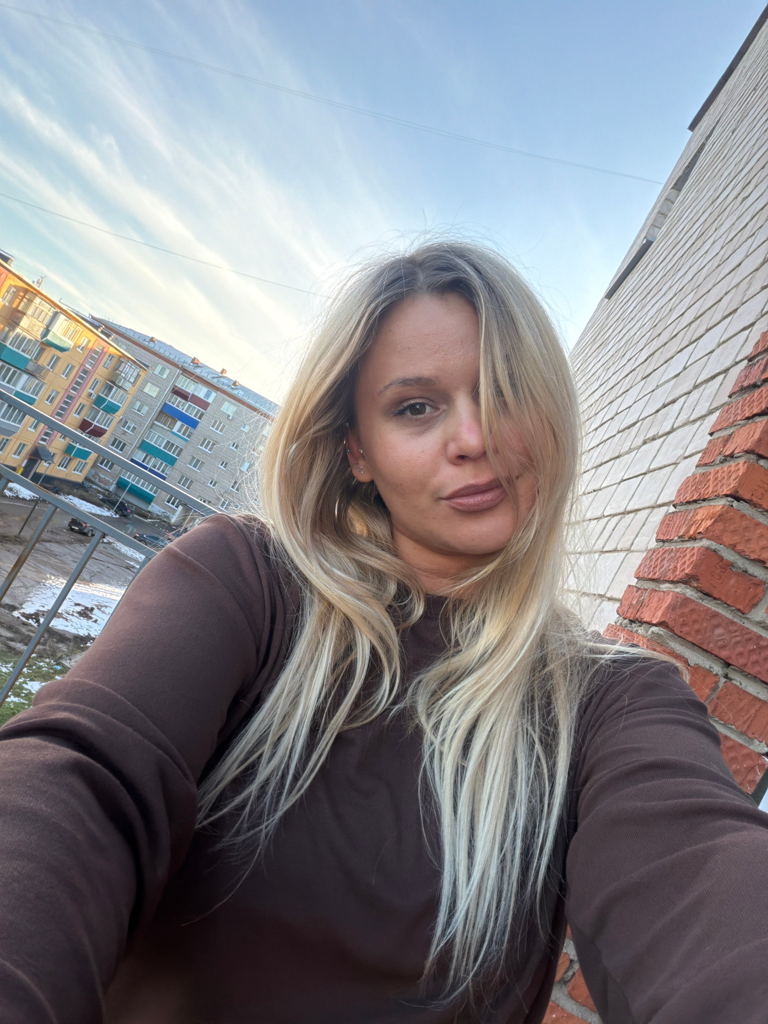 A woman with blonde hair is photographed at eye level, angled with the camera towards her. She is wearing a brown, long-sleeved shirt. Behind her, there is a red brick wall on the right. To the left,…read more