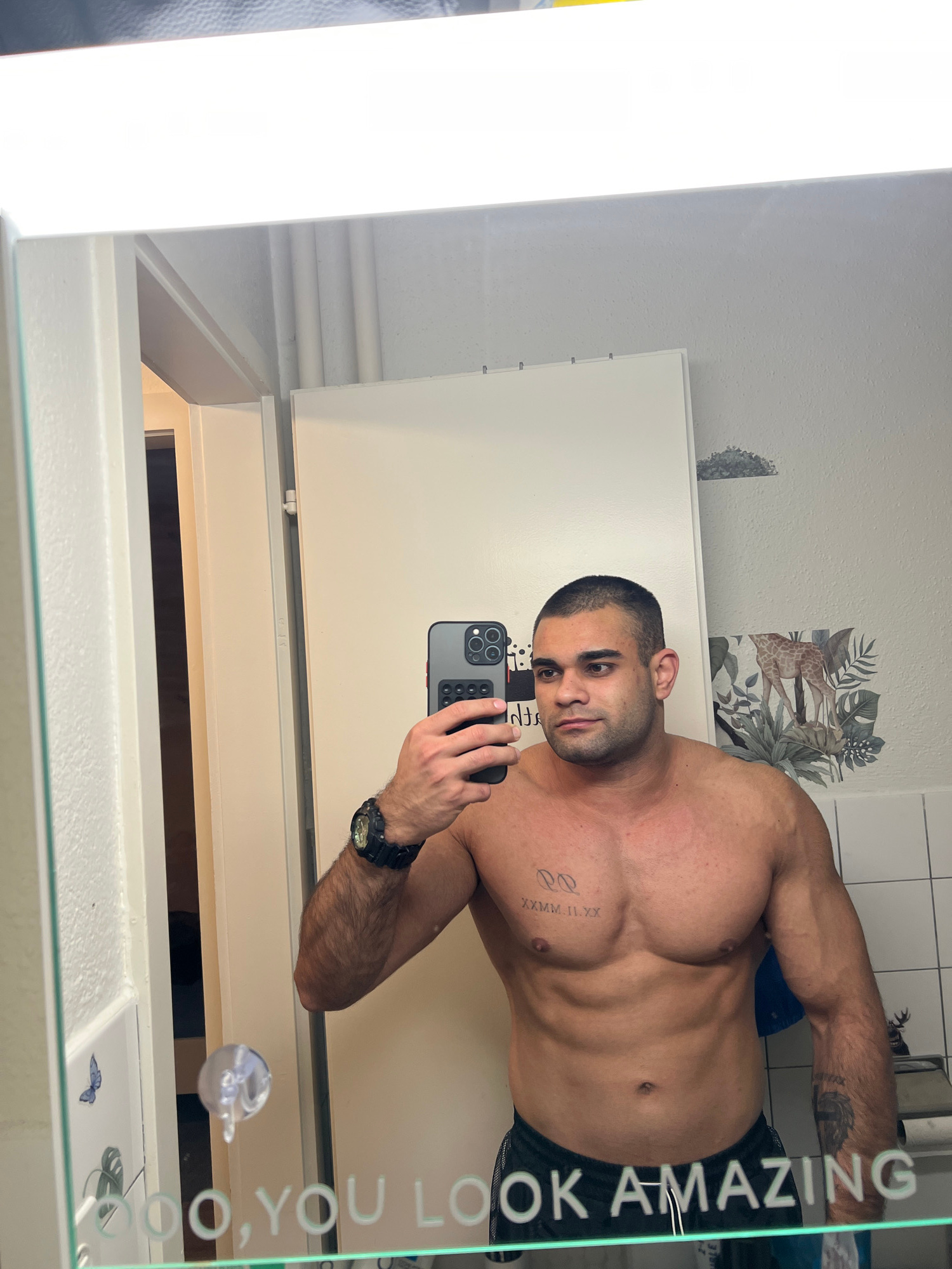 A muscular man with a shaved head is taking a selfie in a bathroom mirror. He is shirtless, wearing dark athletic shorts with white stripes at the sides. He has a watch on his left wrist and tattoos o…read more
