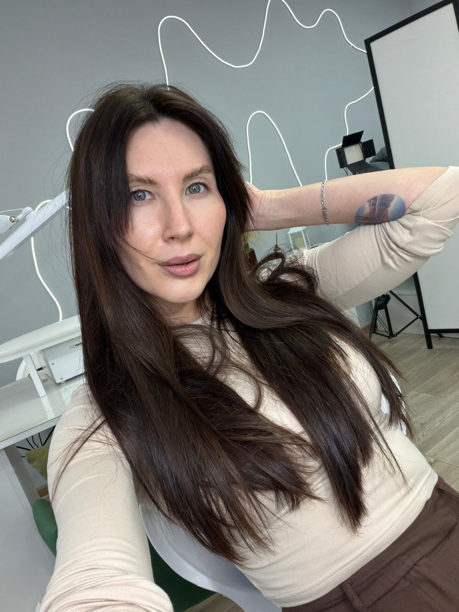 A Caucasian woman with long dark brown hair is pictured indoors. She has fair skin, blue eyes, and is wearing light-colored clothing. A tattoo of a landscape within a circle is visible on her left arm…read more