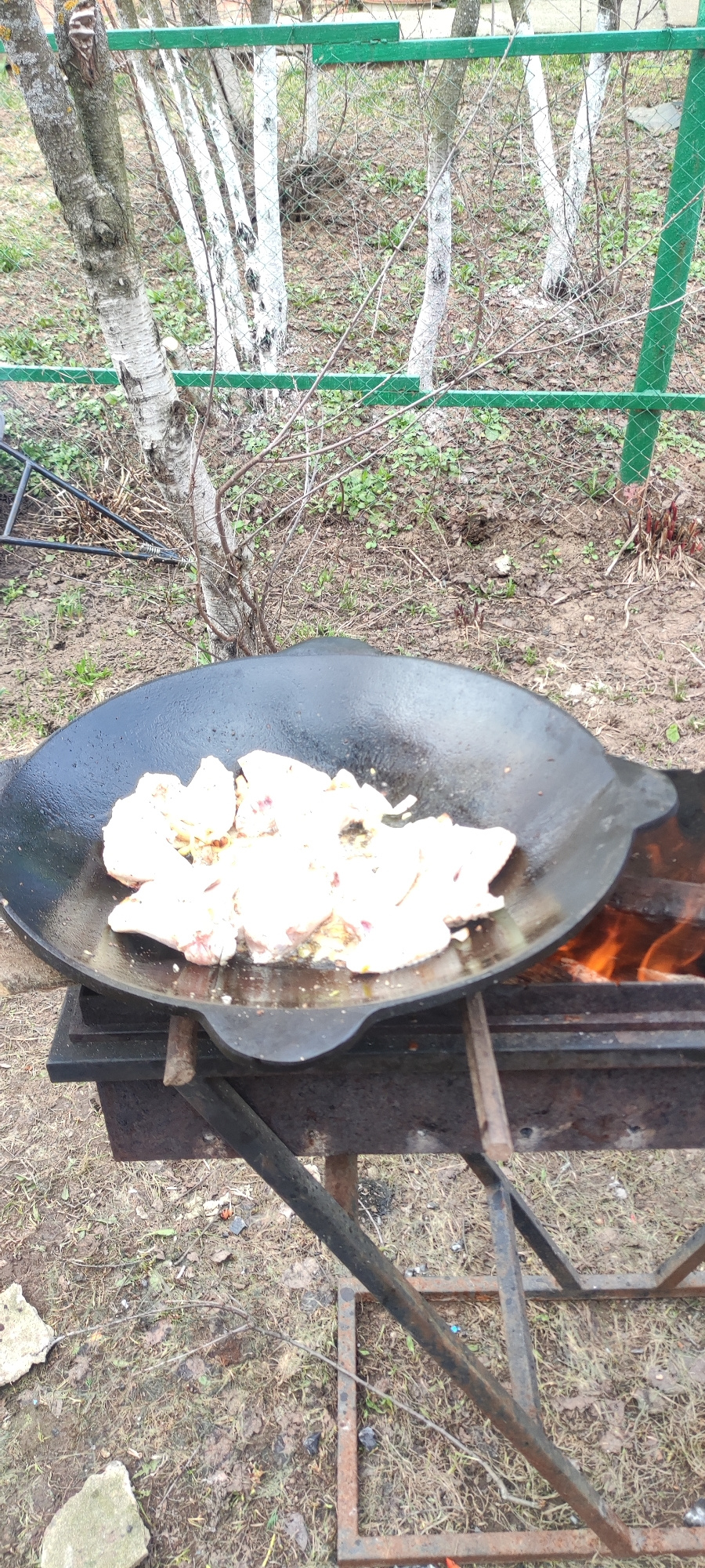 The image depicts an outdoor cooking scene, likely in a residential area. A large, black wok-like pan rests atop a simple, rusty metal stand positioned over an open fire. Inside the pan are chunks of…read more