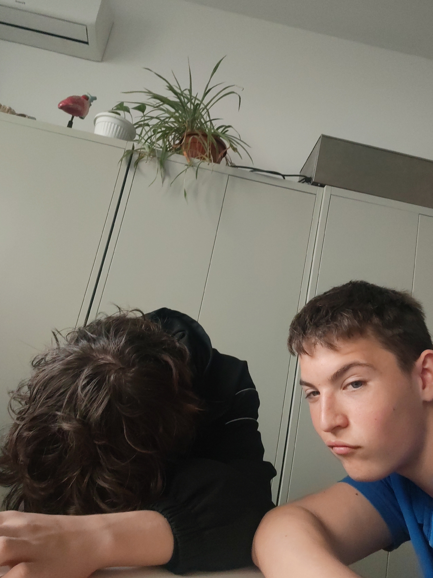 The image depicts two people indoors. On the left, an individual with curly brown hair is resting their head on their arm, wearing a black long-sleeved shirt. On the right, a person with short brown h…read more