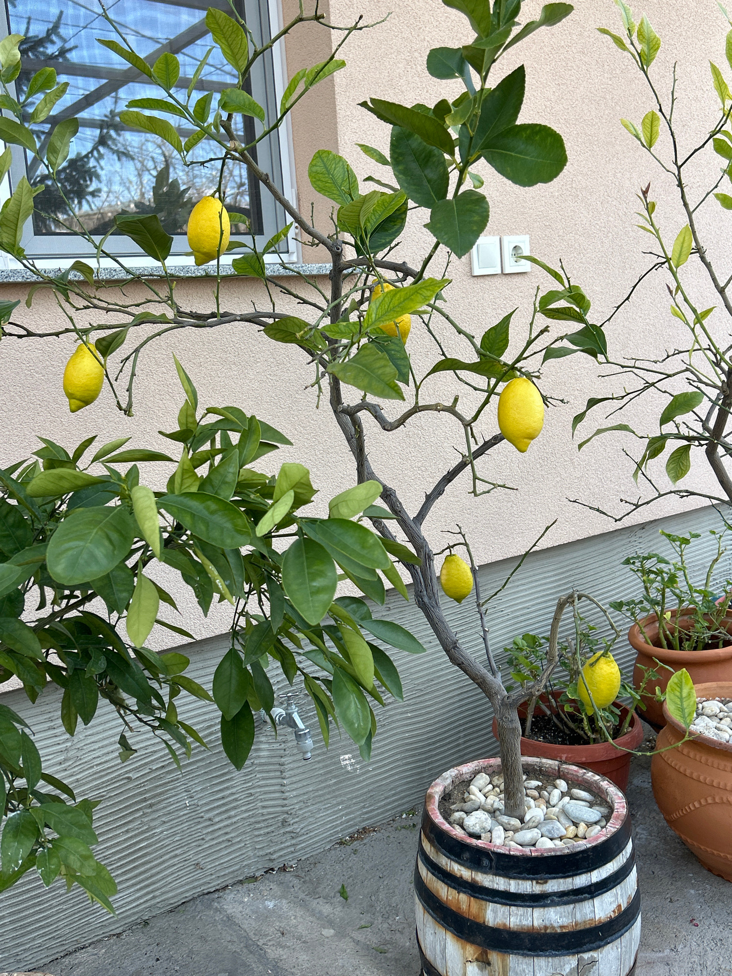The image shows a lemon tree with several ripe lemons growing on its branches. The tree is potted, with one pot being a decorative wooden barrel filled with white stones. The background includes a bui…read more