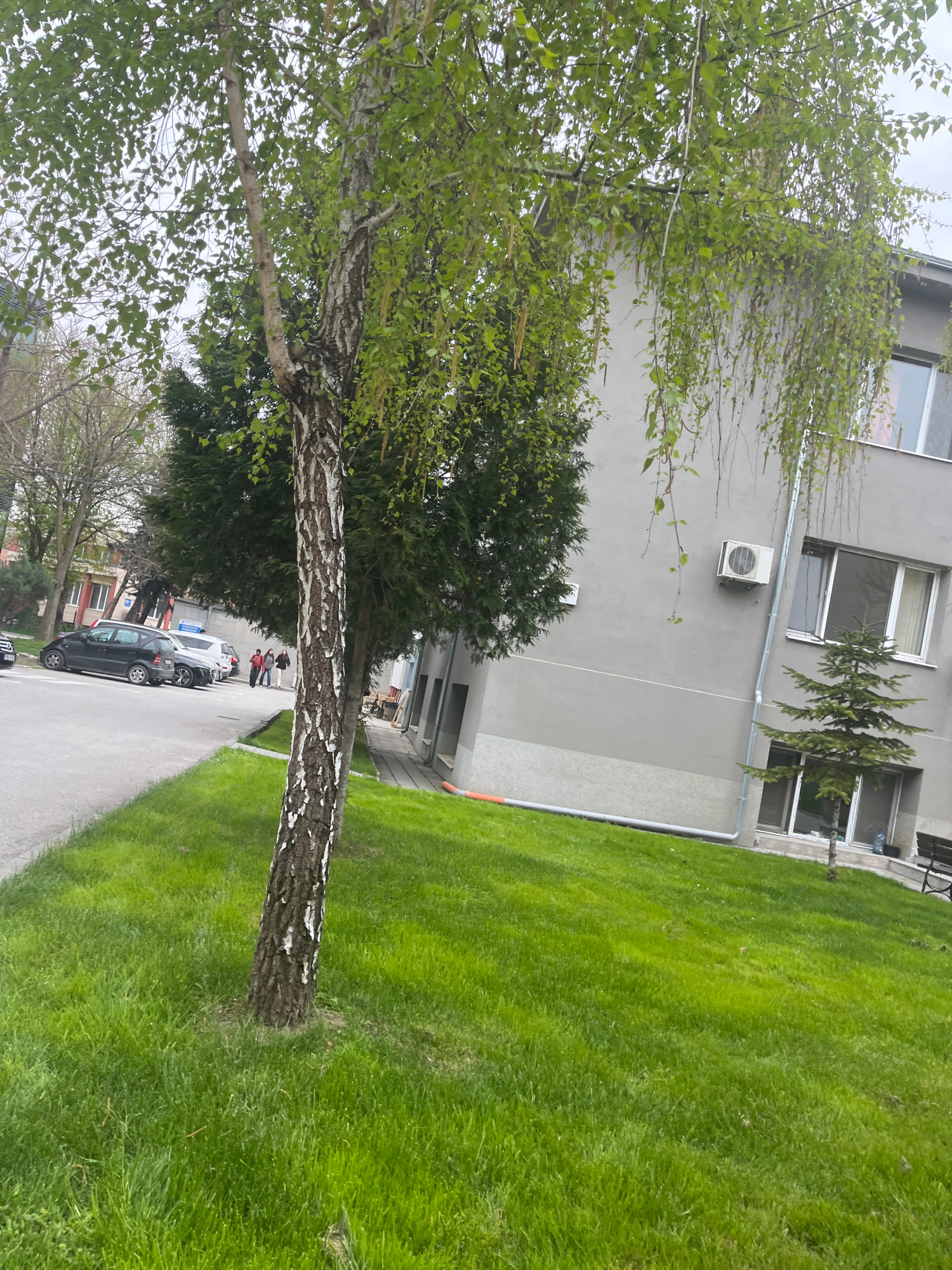 The image captures an outdoor scene in Plovdiv, Bulgaria. A birch tree with a distinctive white bark dominates the left foreground, partially obscuring a gray building in the background. The building…read more