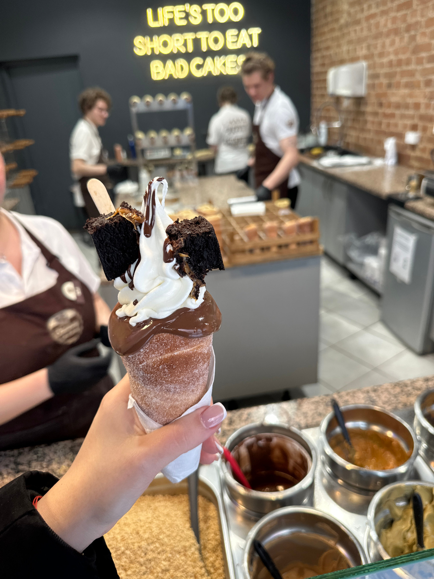 The image depicts a sweet treat, likely a chimney cake or similar pastry, topped with whipped cream and brownie pieces, held by a hand with manicured nails. The treat appears to be dipped in chocolate…read more