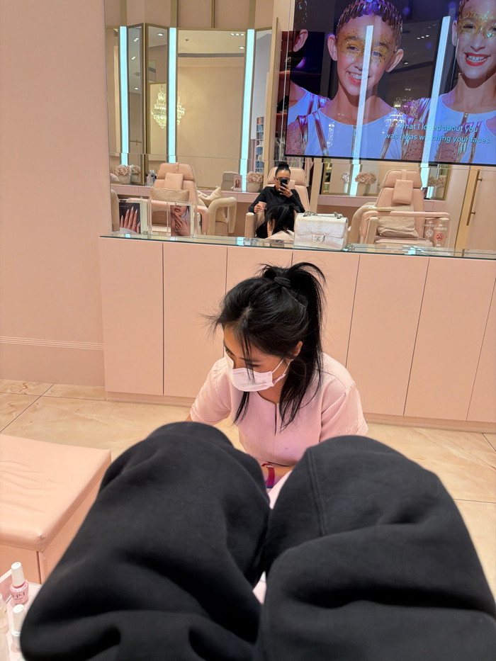 The image shows a salon setting with pink decor. A woman with dark hair in a high ponytail and wearing a light pink shirt and a white face mask is working on someone's nails, with the edge of a black…read more